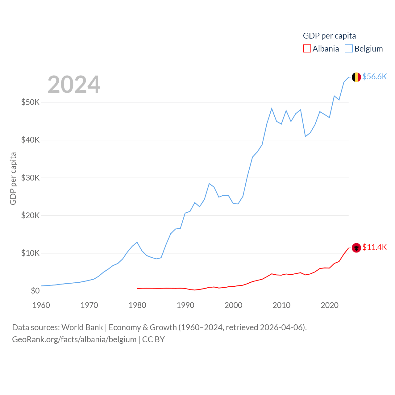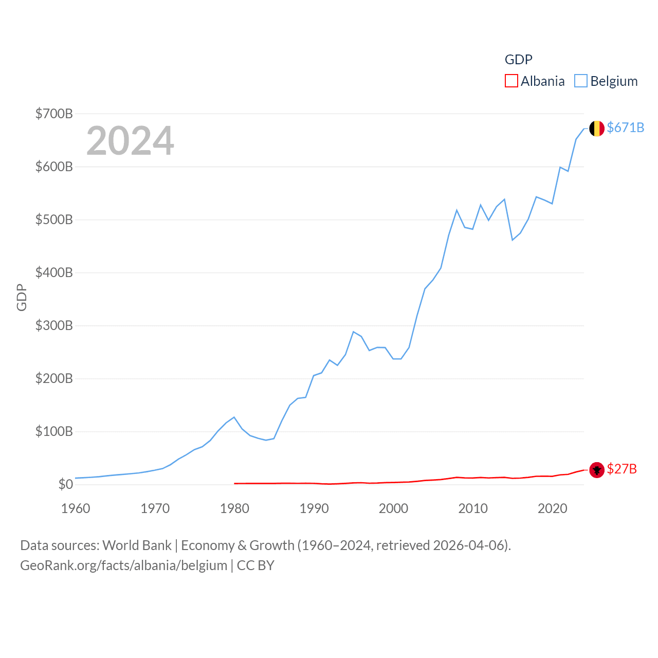 By GDP, Albania ranks 112/197 ($27B) and Belgium ranks 23/197 ($671B). By GDP per capita, Albania ranks 82/197 ($11,378), while Belgium ranks 18/197 ($56,615).