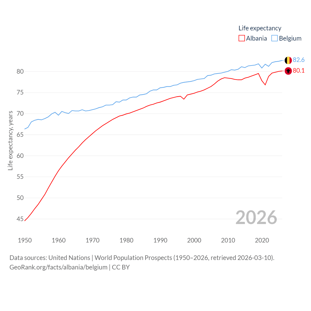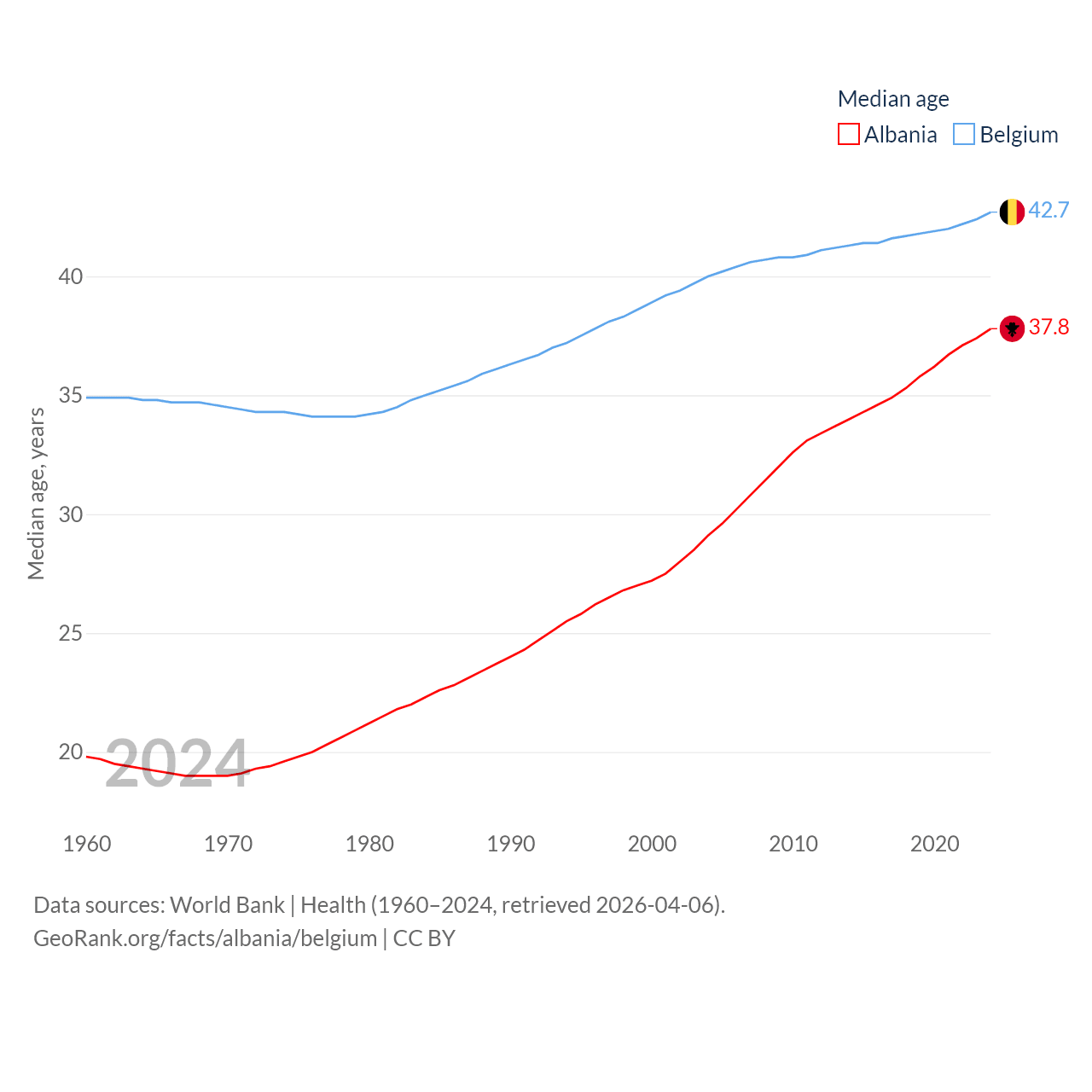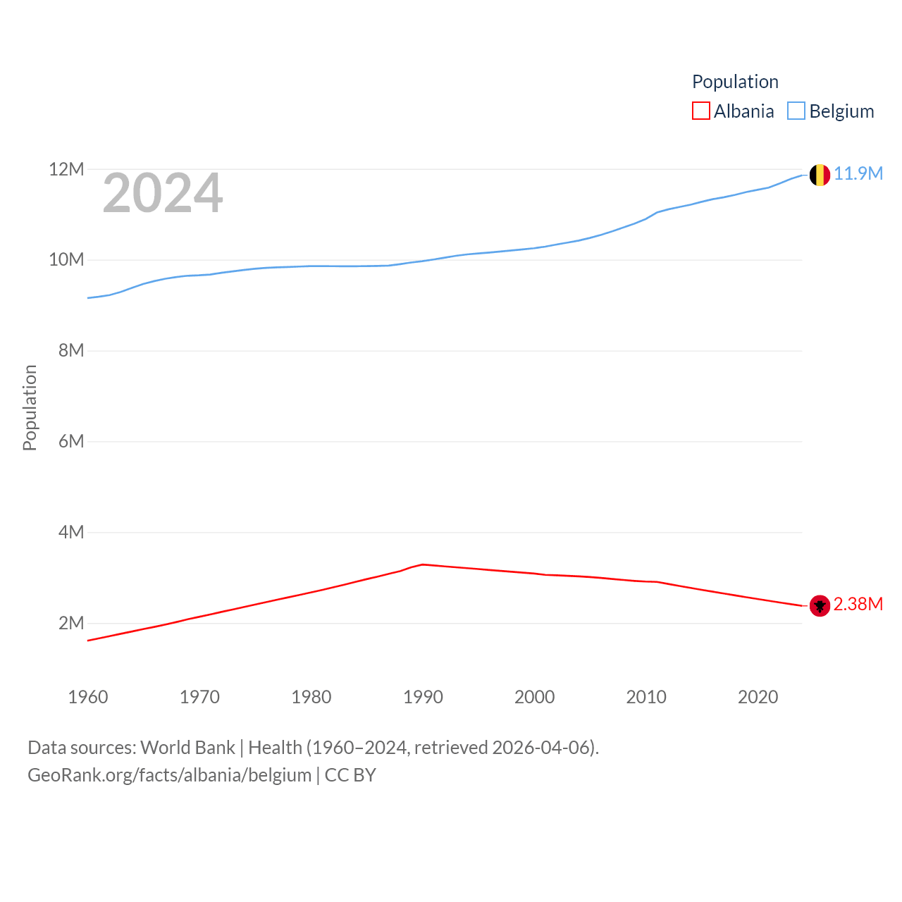 Albania has a population of 2.38M (ranked 144/197), compared with 11.9M in Belgium (ranked 82/197). Albania's land area is 10,579 sq mi versus 11,774 sq mi for Belgium (ranked 143rd vs. 136th).