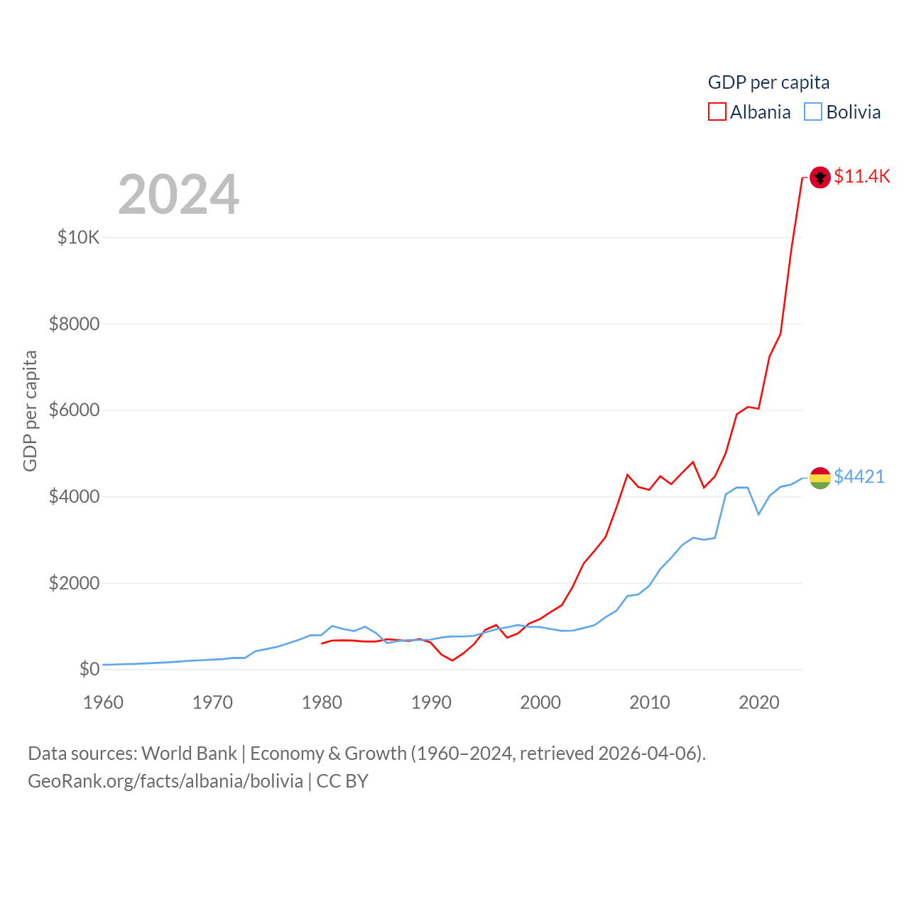 By GDP, Albania ranks 112/197 ($27B) and Bolivia ranks 88/197 ($54.9B). By GDP per capita, Albania ranks 82/197 ($11,378), while Bolivia ranks 125/197 ($4,421).