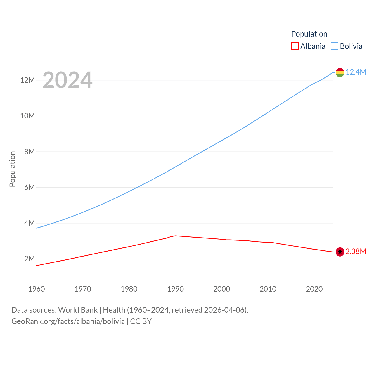 Albania has a population of 2.38M (ranked 144/197), compared with 12.4M in Bolivia (ranked 79/197). Albania's land area is 10,579 sq mi versus 418,264 sq mi for Bolivia (ranked 143rd vs. 27th).
