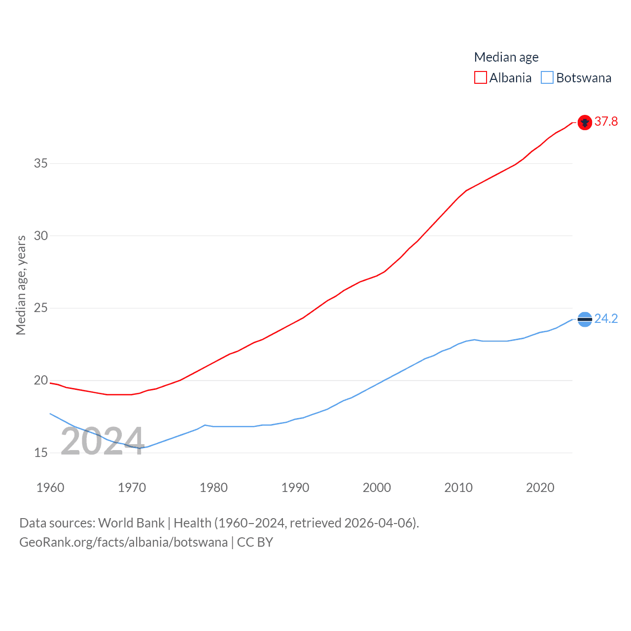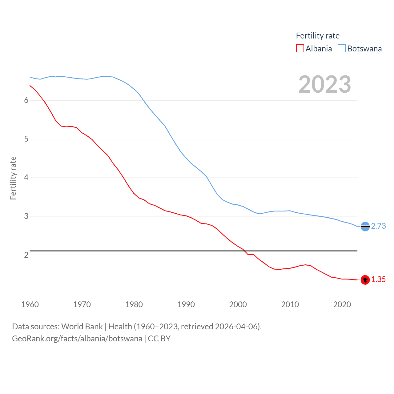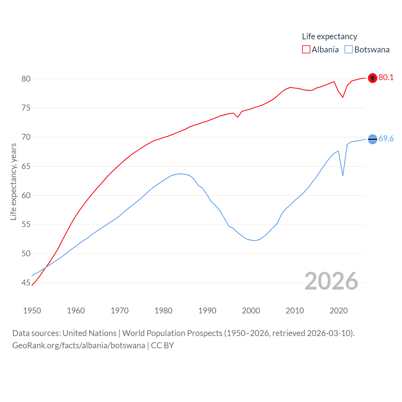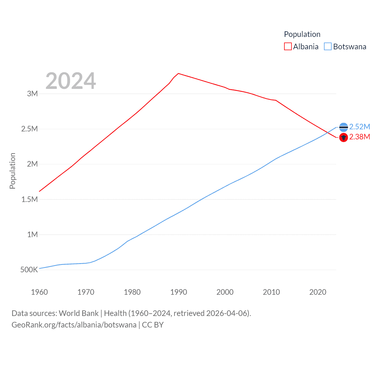 Albania has a population of 2.38M (ranked 144/197), compared with 2.52M in Botswana (ranked 142/197). Albania's land area is 10,579 sq mi versus 218,816 sq mi for Botswana (ranked 143rd vs. 47th).