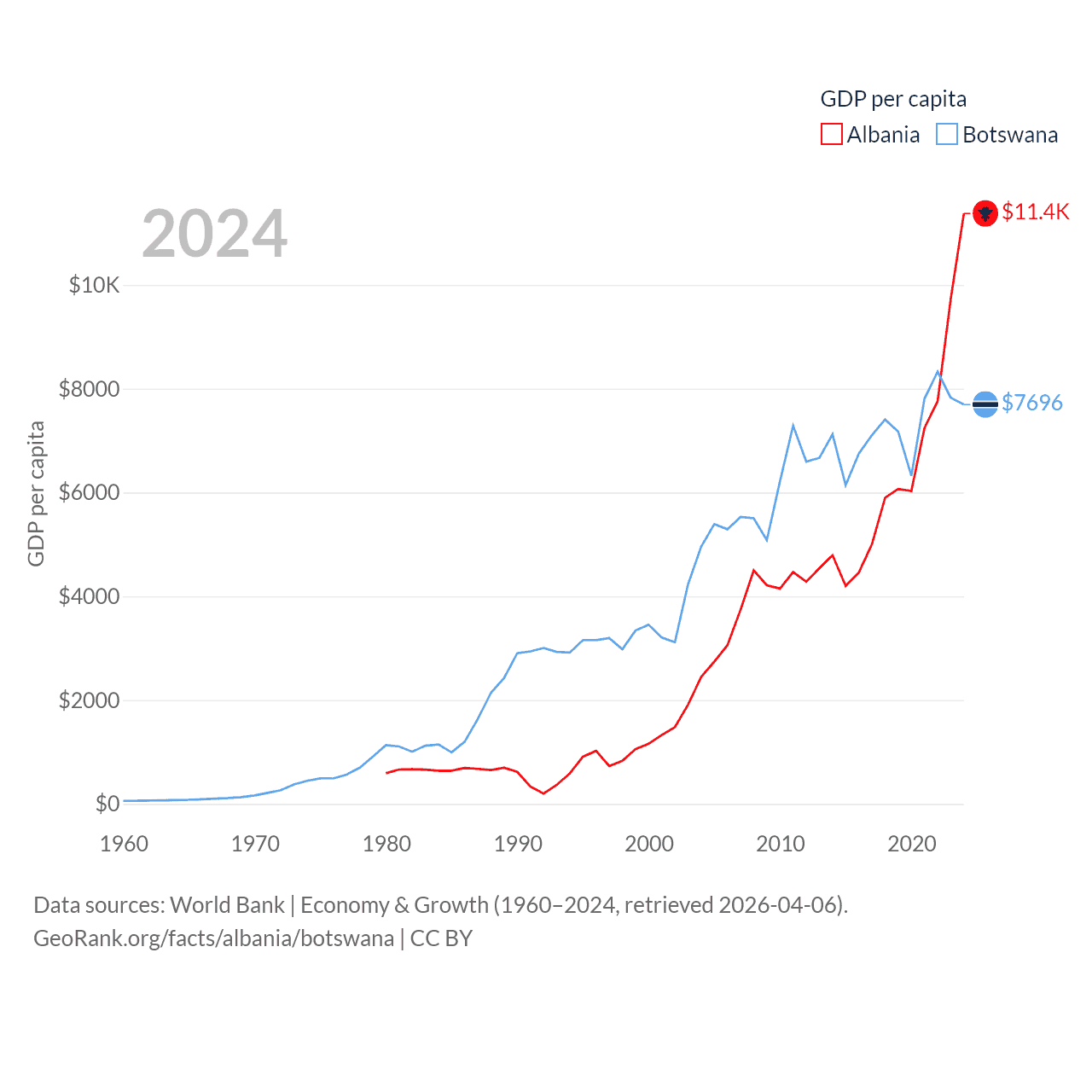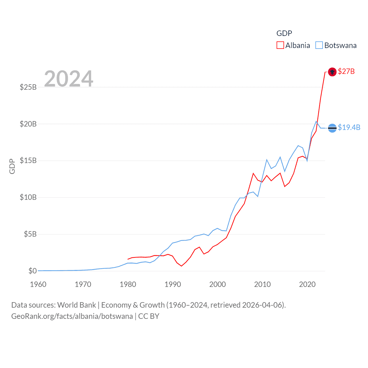 By GDP, Albania ranks 112/197 ($27B) and Botswana ranks 133/197 ($19.4B). By GDP per capita, Albania ranks 82/197 ($11,378), while Botswana ranks 97/197 ($7,696).