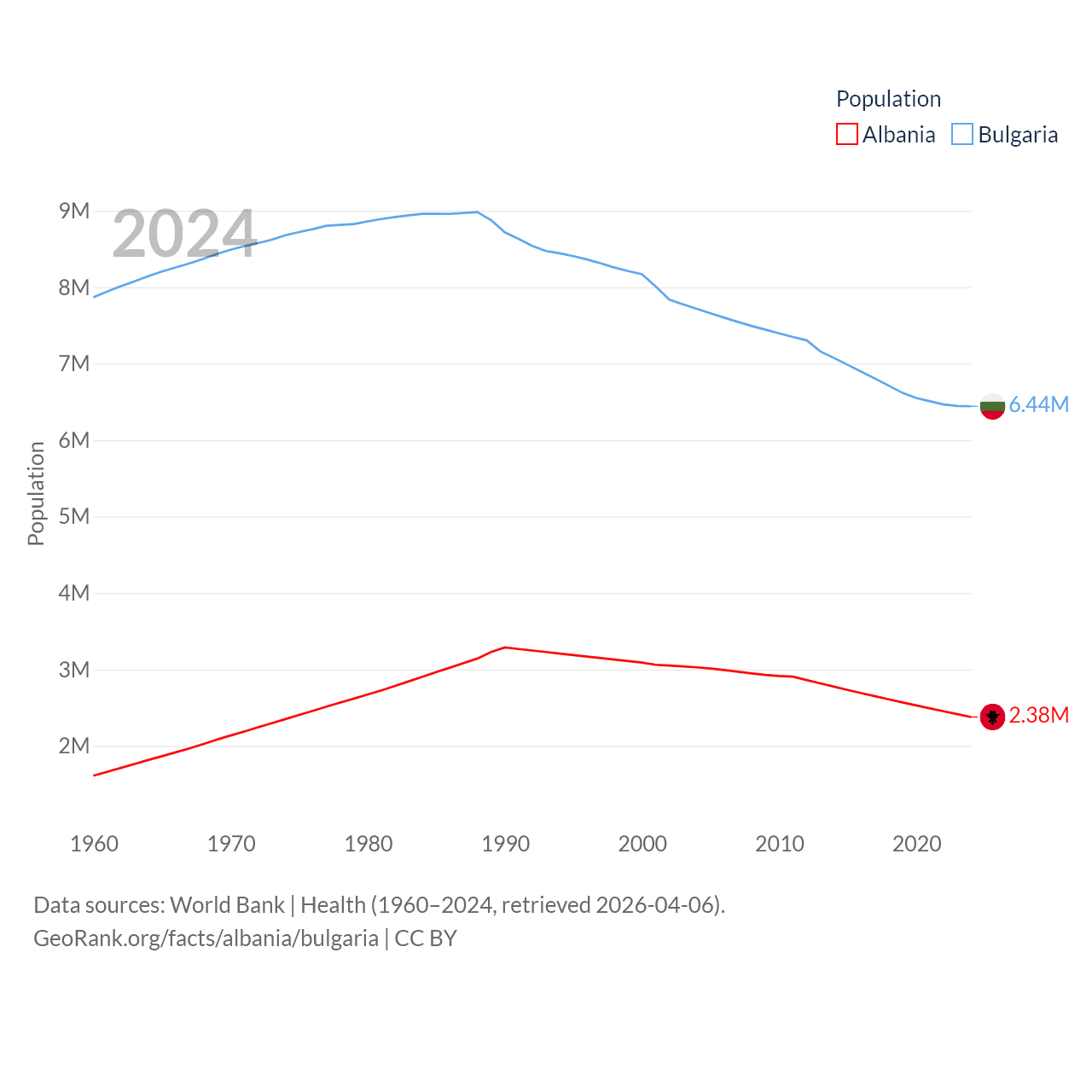 Albania has a population of 2.38M (ranked 144/197), compared with 6.44M in Bulgaria (ranked 110/197). Albania's land area is 10,579 sq mi versus 41,915 sq mi for Bulgaria (ranked 143rd vs. 101st).