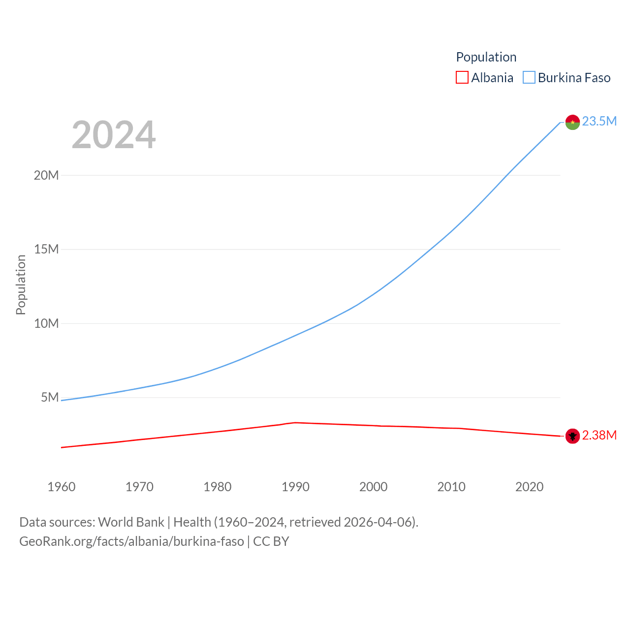 Albania has a population of 2.38M (ranked 144/197), compared with 23.5M in Burkina Faso (ranked 59/197). Albania's land area is 10,579 sq mi versus 105,638 sq mi for Burkina Faso (ranked 143rd vs. 73rd).