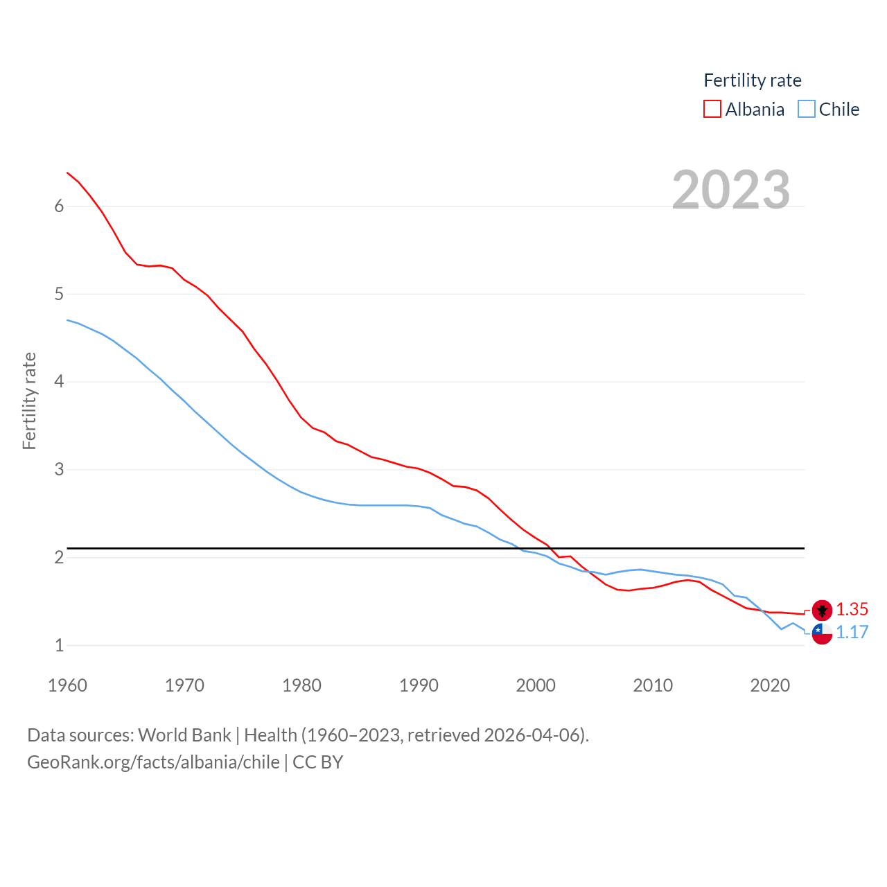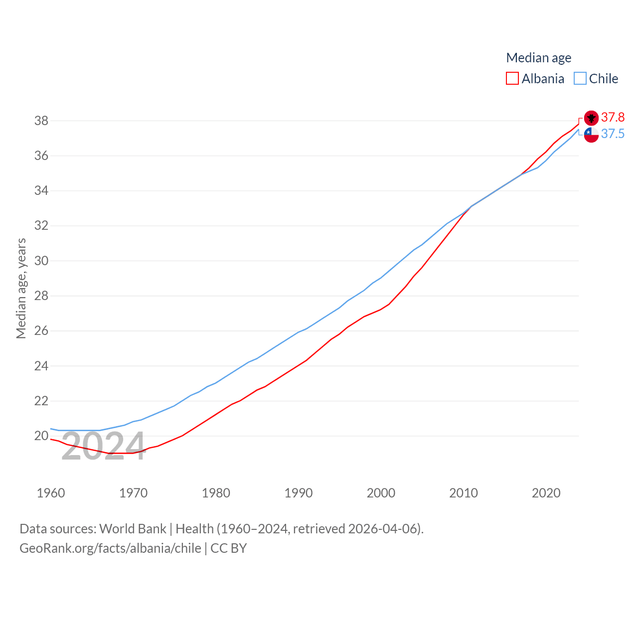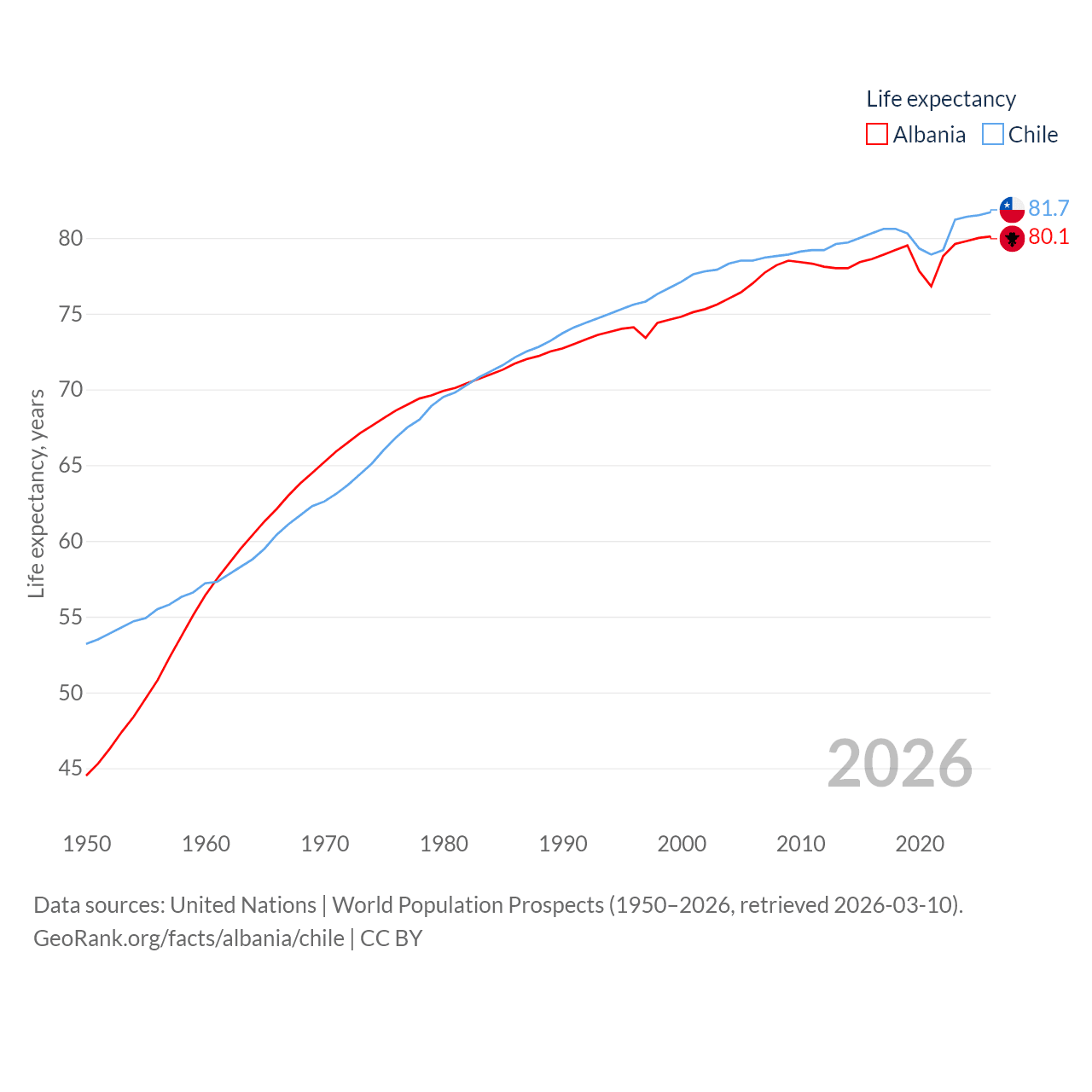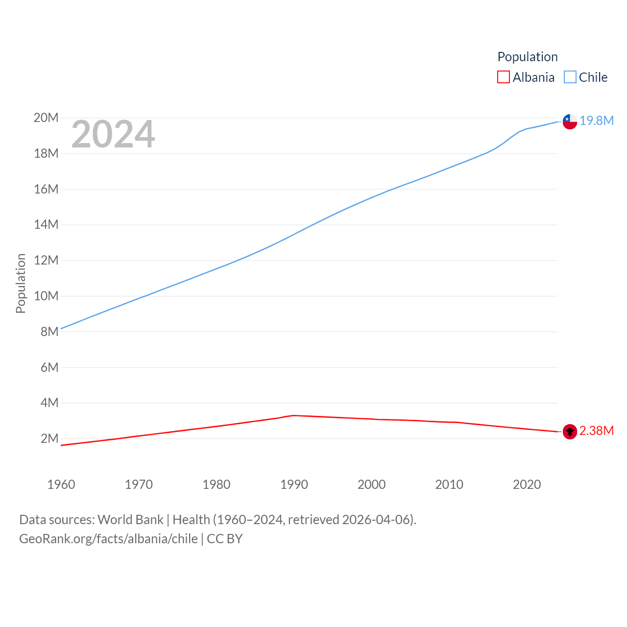 Albania has a population of 2.38M (ranked 144/197), compared with 19.8M in Chile (ranked 66/197). Albania's land area is 10,579 sq mi versus 286,809 sq mi for Chile (ranked 143rd vs. 38th).