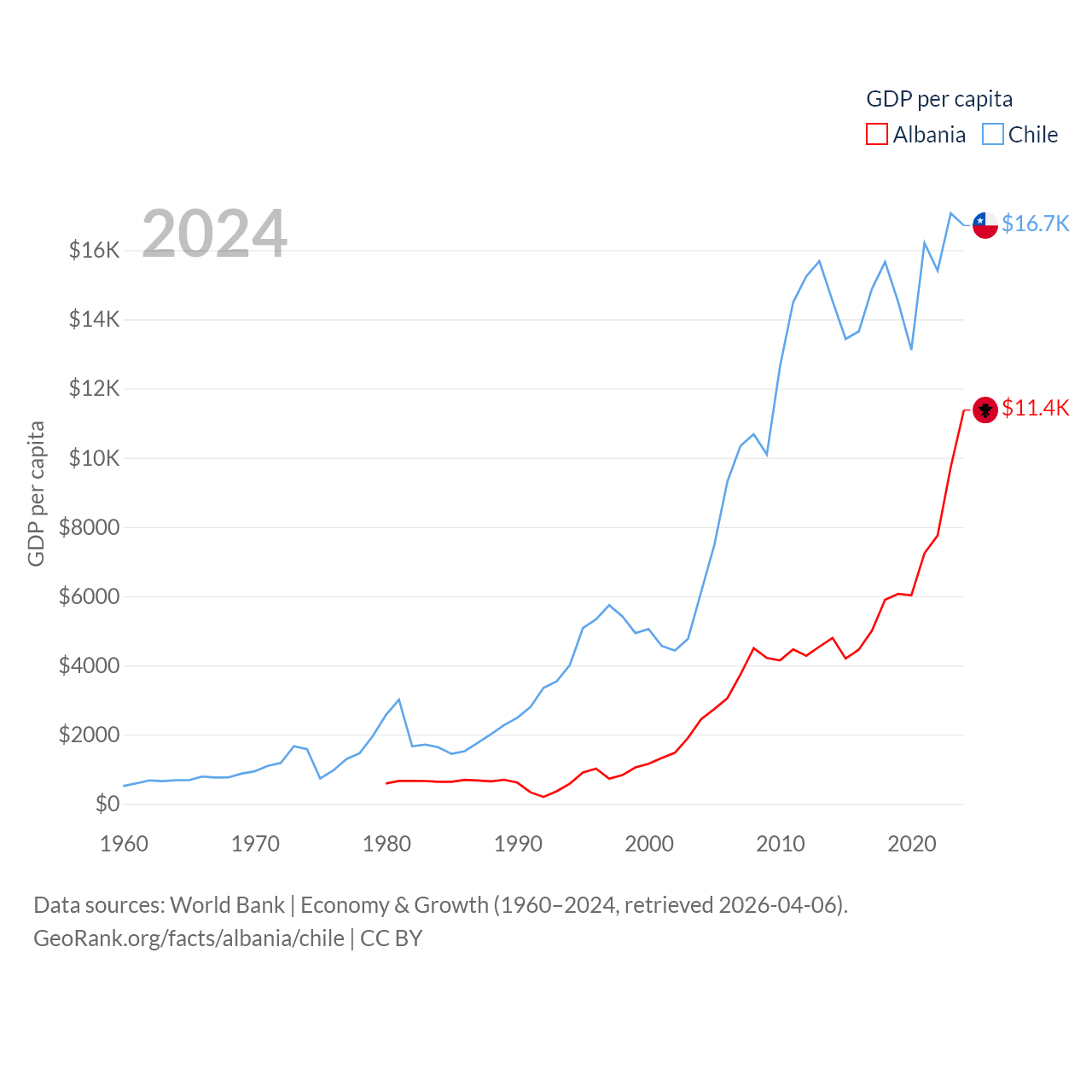 By GDP, Albania ranks 112/197 ($27B) and Chile ranks 45/197 ($330B). By GDP per capita, Albania ranks 82/197 ($11,378), while Chile ranks 65/197 ($16,710).