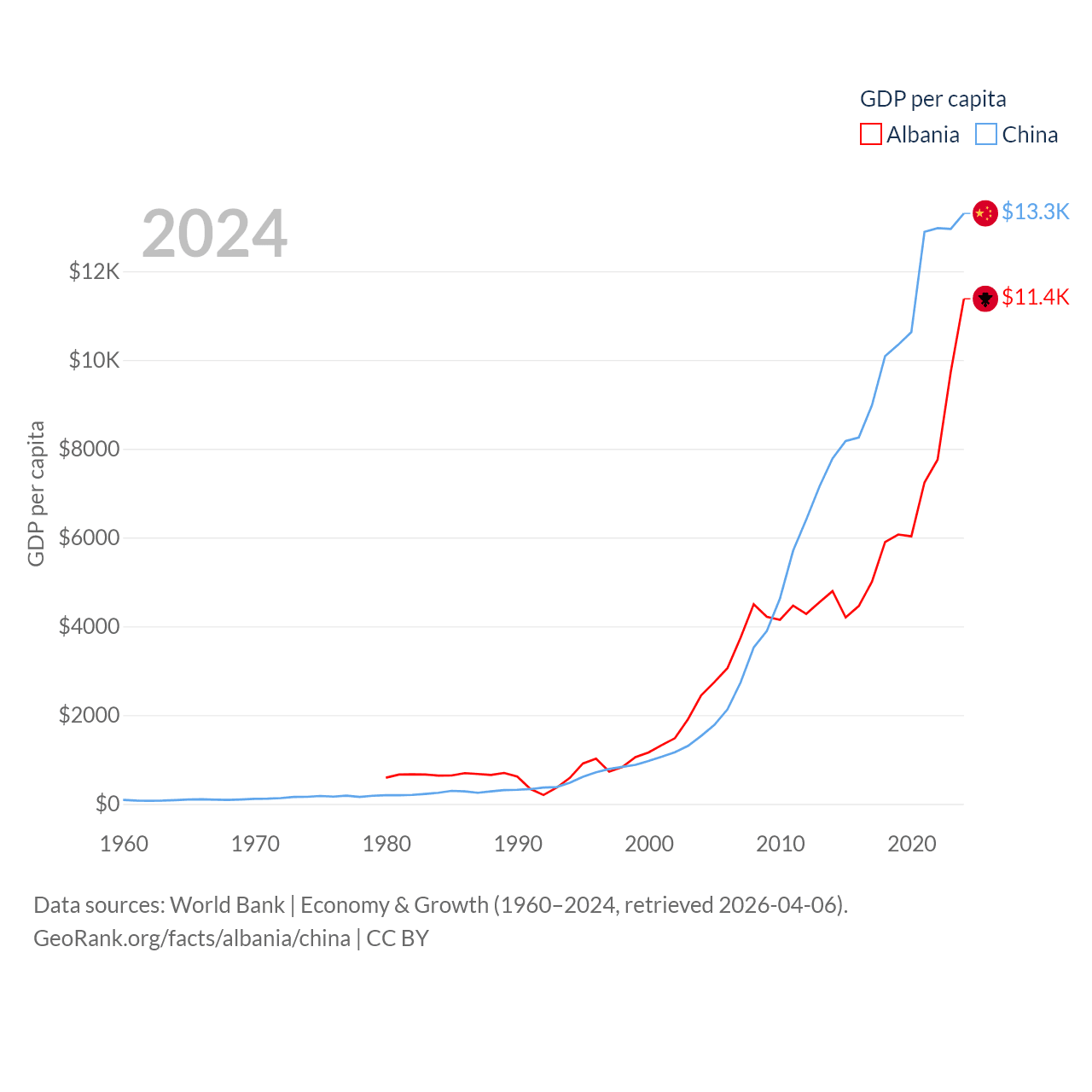 By GDP, Albania ranks 112/197 ($27B) and China ranks 2/197 ($18.7T). By GDP per capita, Albania ranks 82/197 ($11,378), while China ranks 76/197 ($13,303).