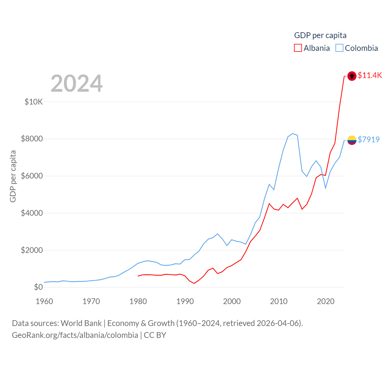 By GDP, Albania ranks 112/197 ($27B) and Colombia ranks 39/197 ($419B). By GDP per capita, Albania ranks 82/197 ($11,378), while Colombia ranks 94/197 ($7,919).