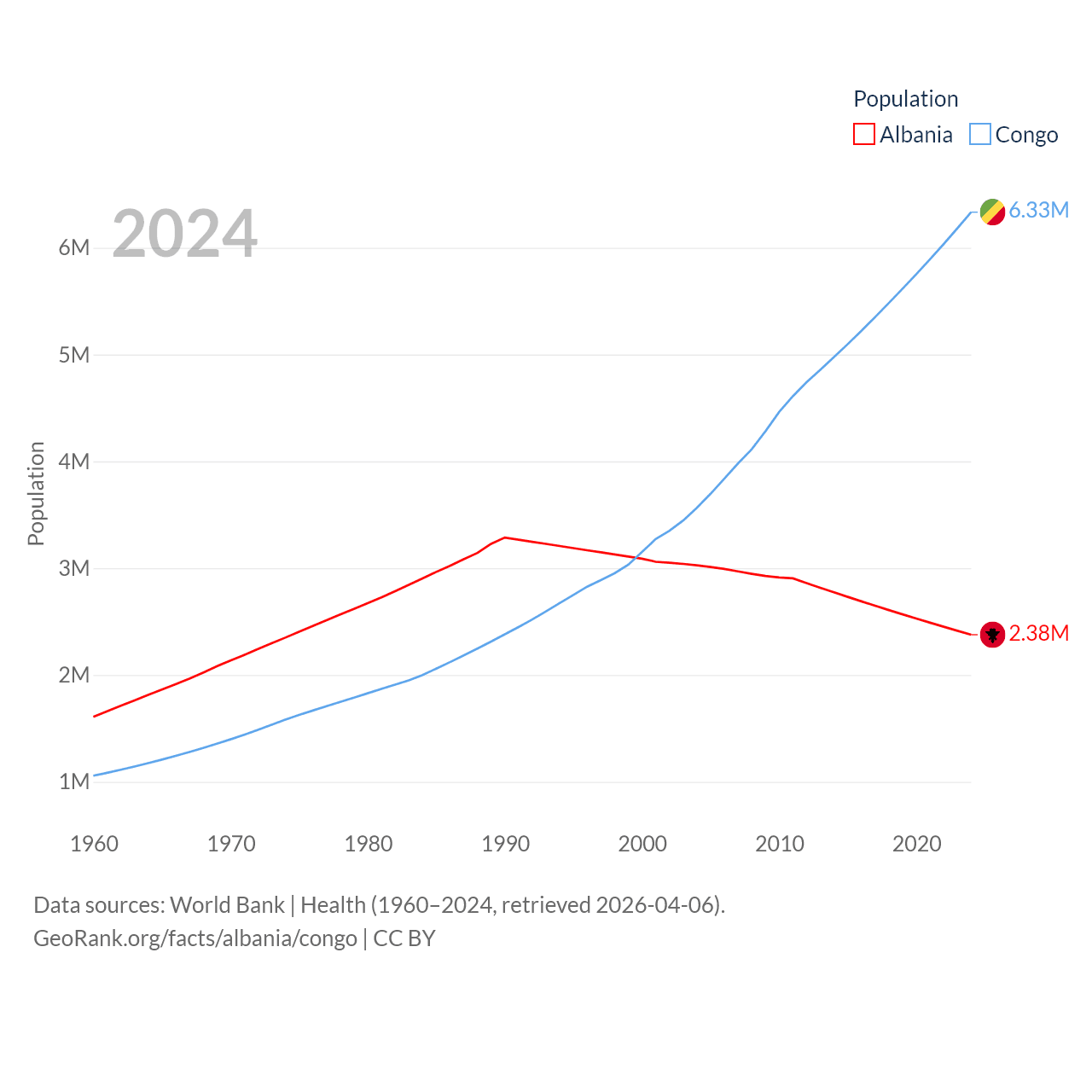 Albania has a population of 2.38M (ranked 144/197), compared with 6.33M in The Congo (ranked 112/197). Albania's land area is 10,579 sq mi versus 131,854 sq mi for The Congo (ranked 143rd vs. 64th).