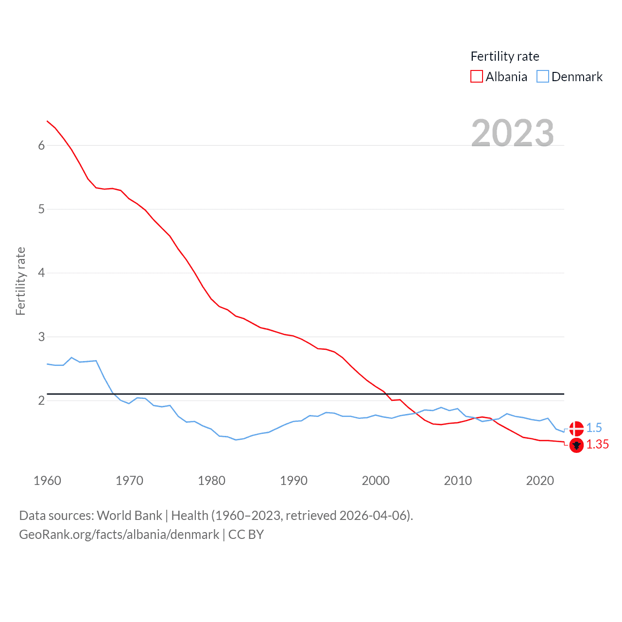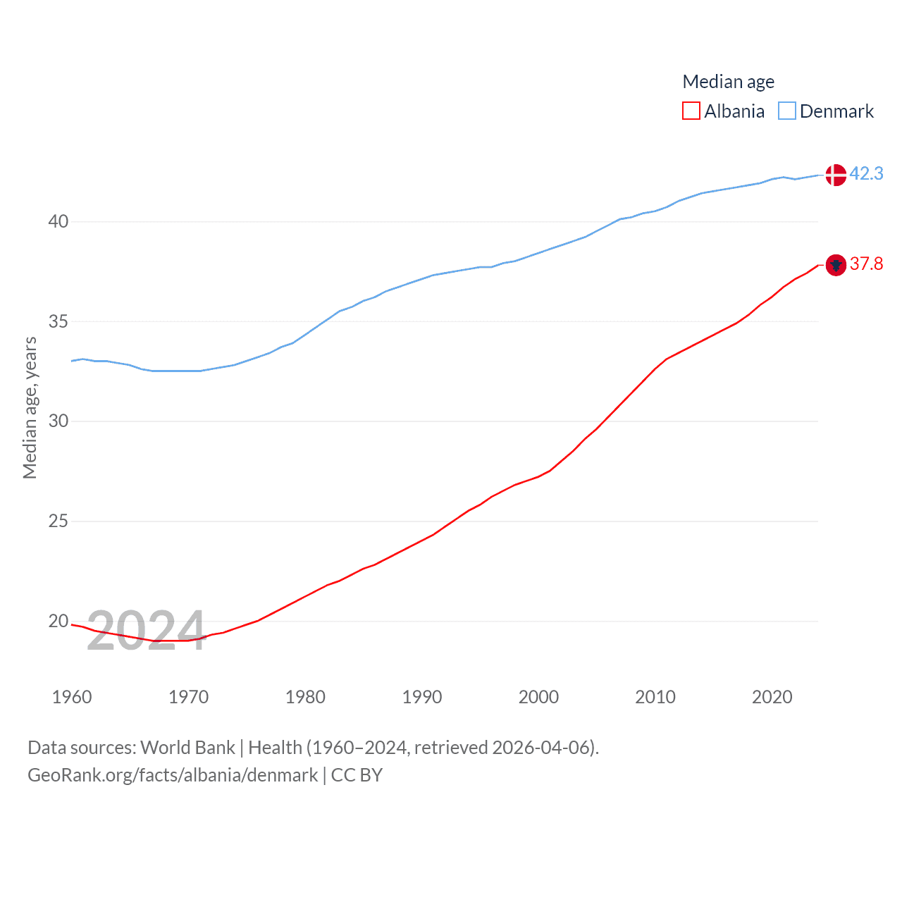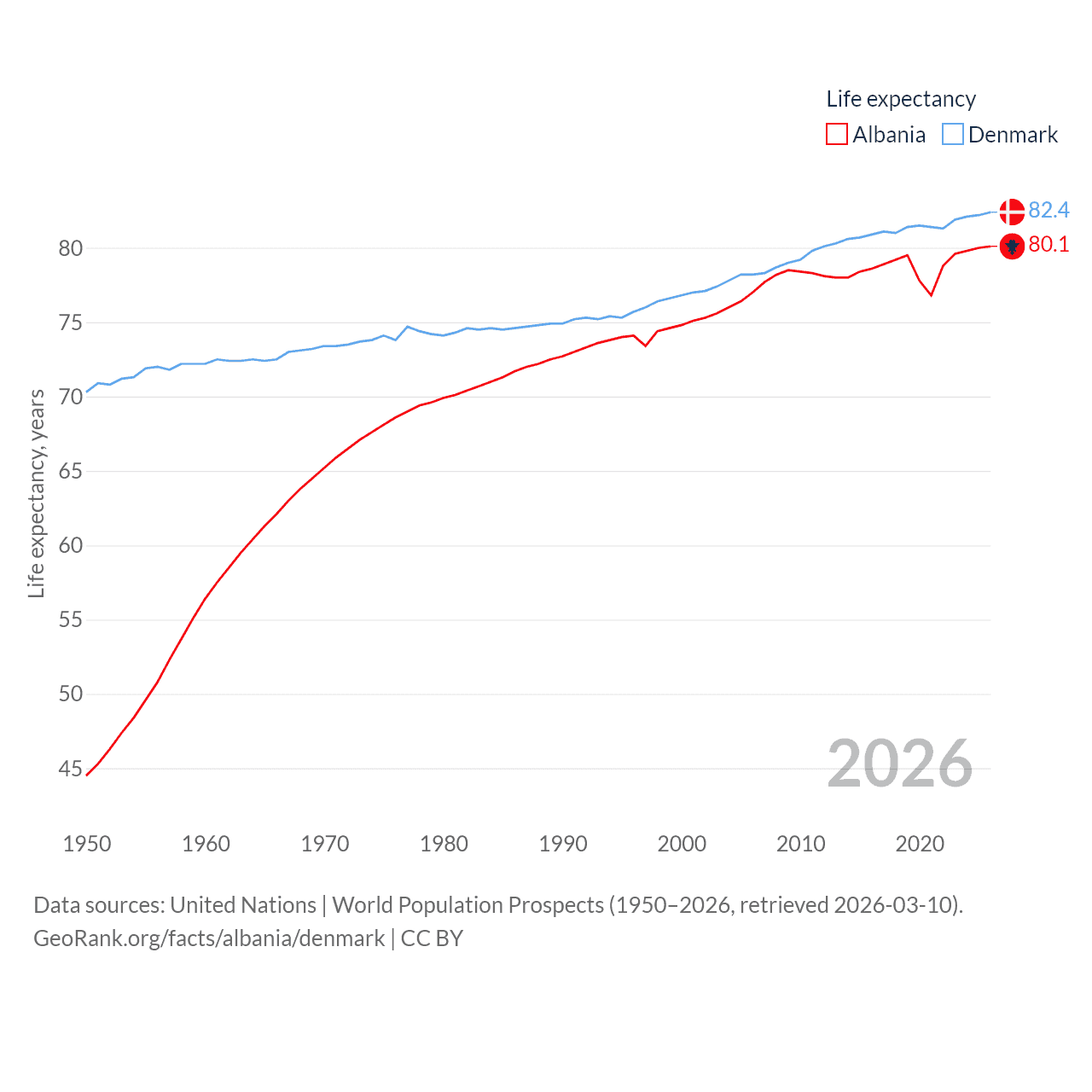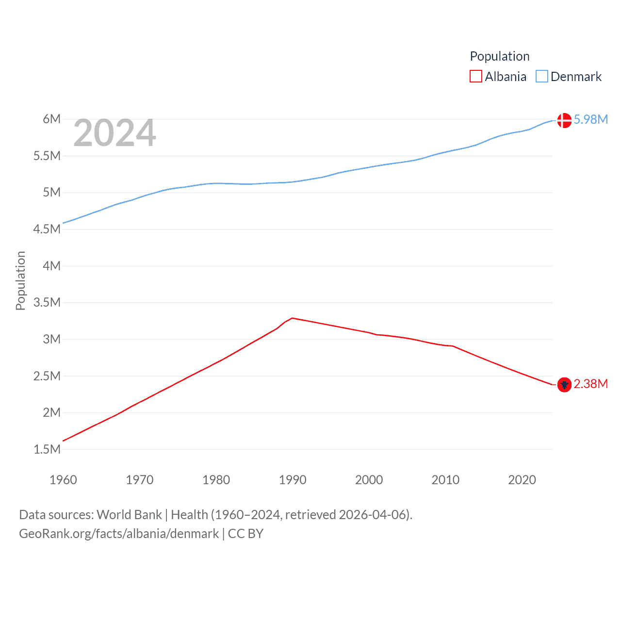 Albania has a population of 2.38M (ranked 144/197), compared with 5.98M in Denmark (ranked 114/197). Albania's land area is 10,579 sq mi versus 15,444 sq mi for Denmark (ranked 143rd vs. 130th).