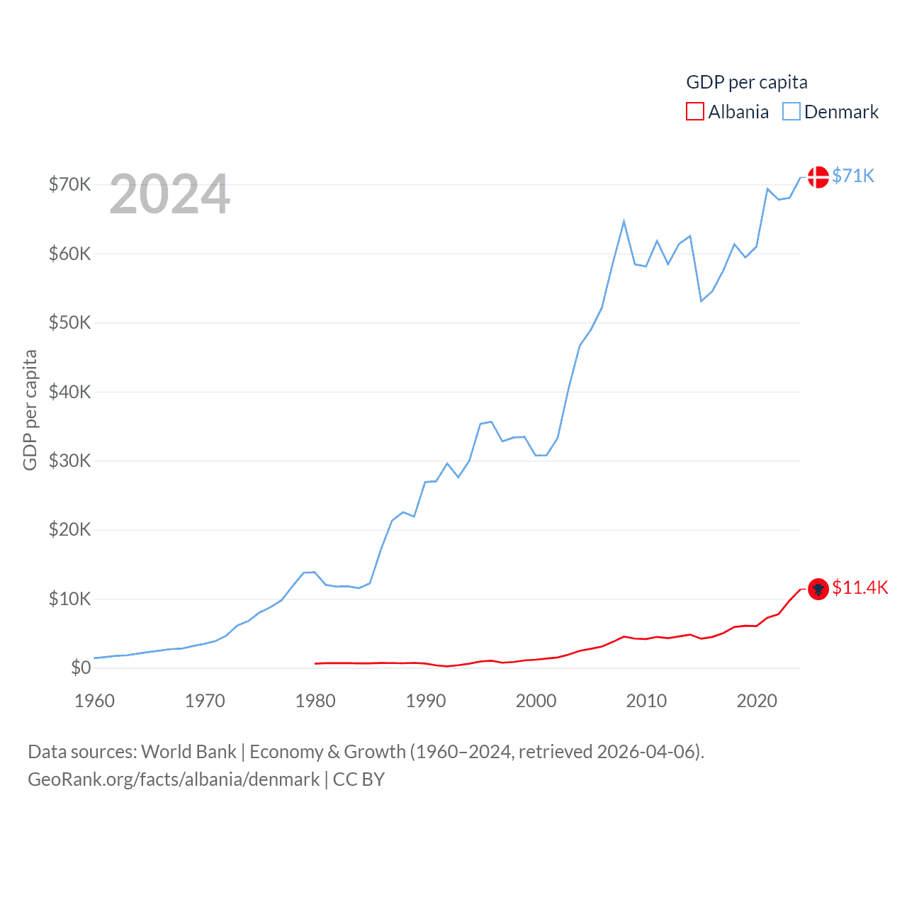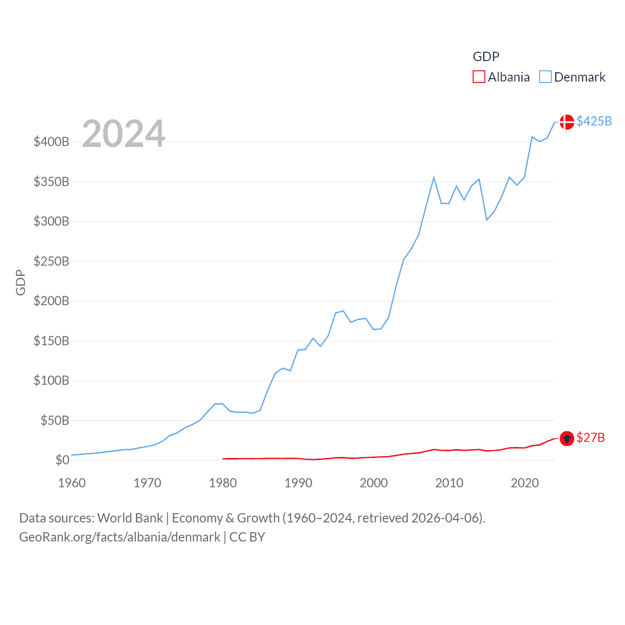 By GDP, Albania ranks 112/197 ($27B) and Denmark ranks 37/197 ($425B). By GDP per capita, Albania ranks 82/197 ($11,378), while Denmark ranks 12/197 ($71,026).