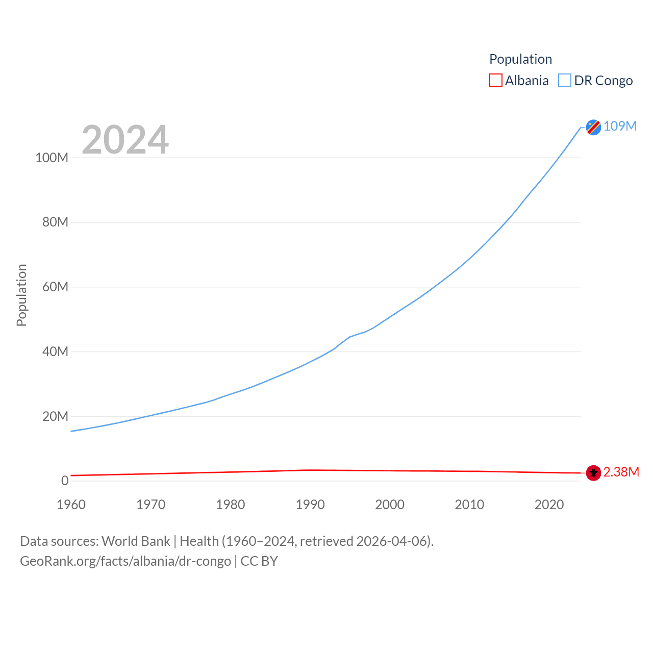 Albania has a population of 2.38M (ranked 144/197), compared with 109M in The DR Congo (ranked 15/197). Albania's land area is 10,579 sq mi versus 875,313 sq mi for The DR Congo (ranked 143rd vs. 11th).