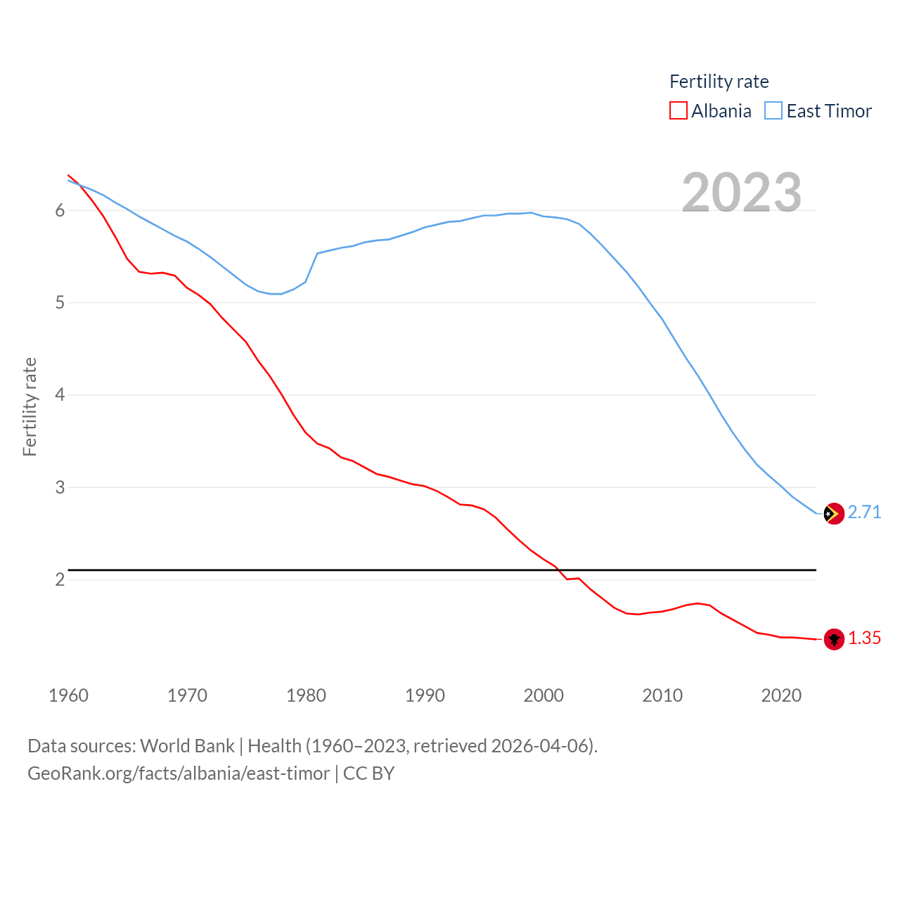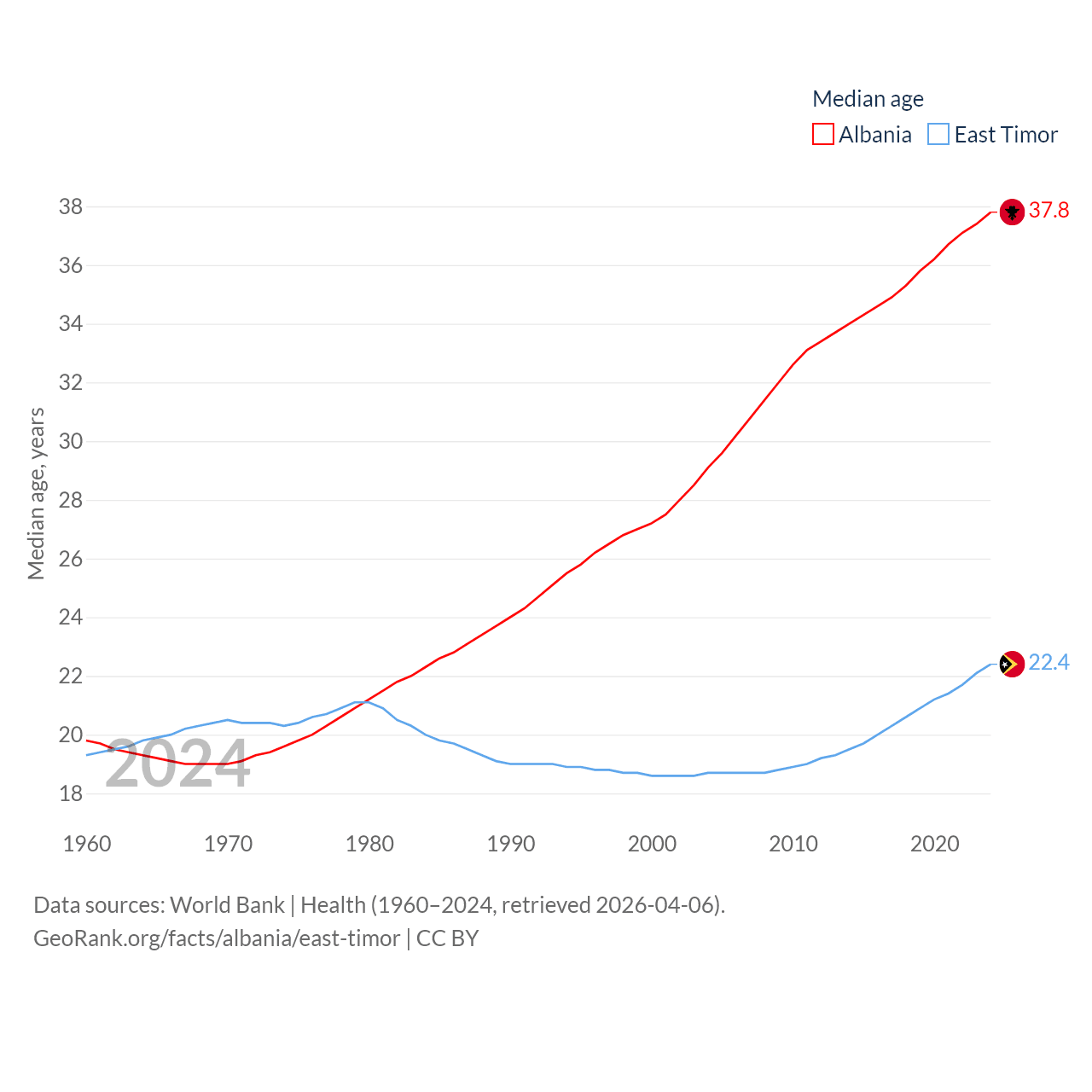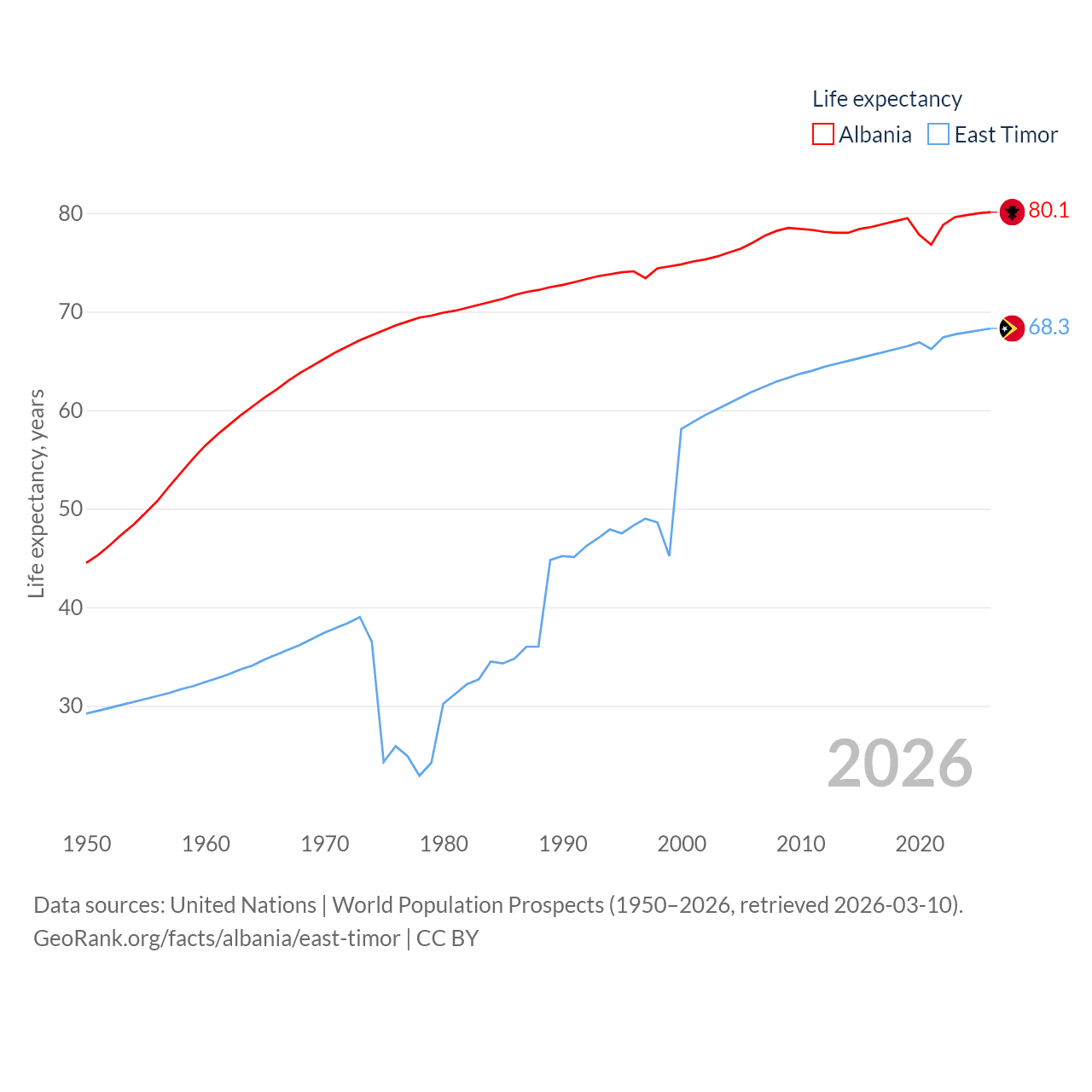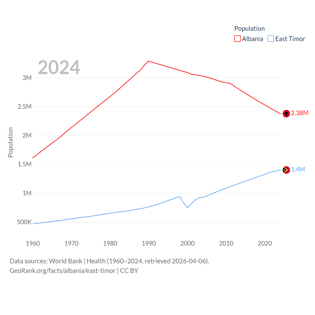 Albania has a population of 2.38M (ranked 144/197), compared with 1.4M in East Timor (ranked 152/197). Albania's land area is 10,579 sq mi versus 5,741 sq mi for East Timor (ranked 143rd vs. 155th).