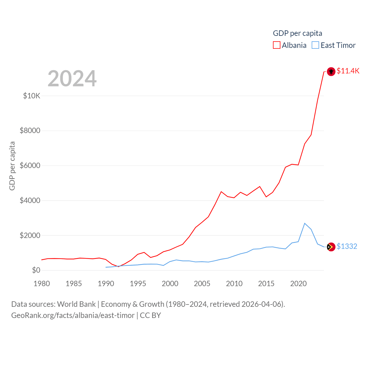 By GDP, Albania ranks 112/197 ($27B) and East Timor ranks 181/197 ($1.87B). By GDP per capita, Albania ranks 82/197 ($11,378), while East Timor ranks 167/197 ($1,332).