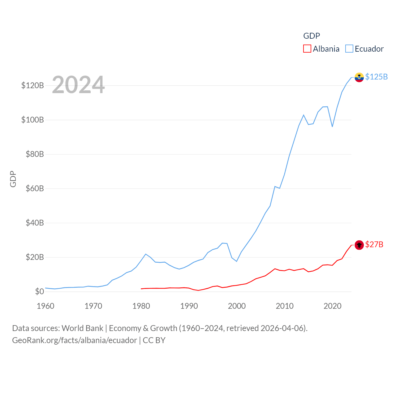 By GDP, Albania ranks 112/197 ($27B) and Ecuador ranks 62/197 ($125B). By GDP per capita, Albania ranks 82/197 ($11,378), while Ecuador ranks 103/197 ($6,875).