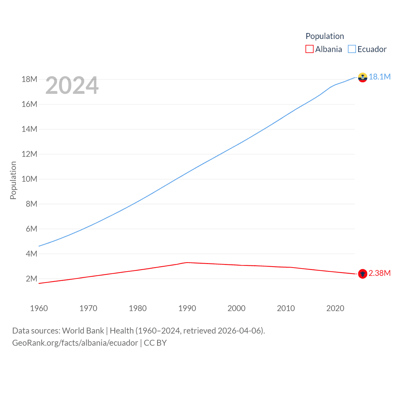 Albania has a population of 2.38M (ranked 144/197), compared with 18.1M in Ecuador (ranked 71/197). Albania's land area is 10,579 sq mi versus 95,892 sq mi for Ecuador (ranked 143rd vs. 76th).