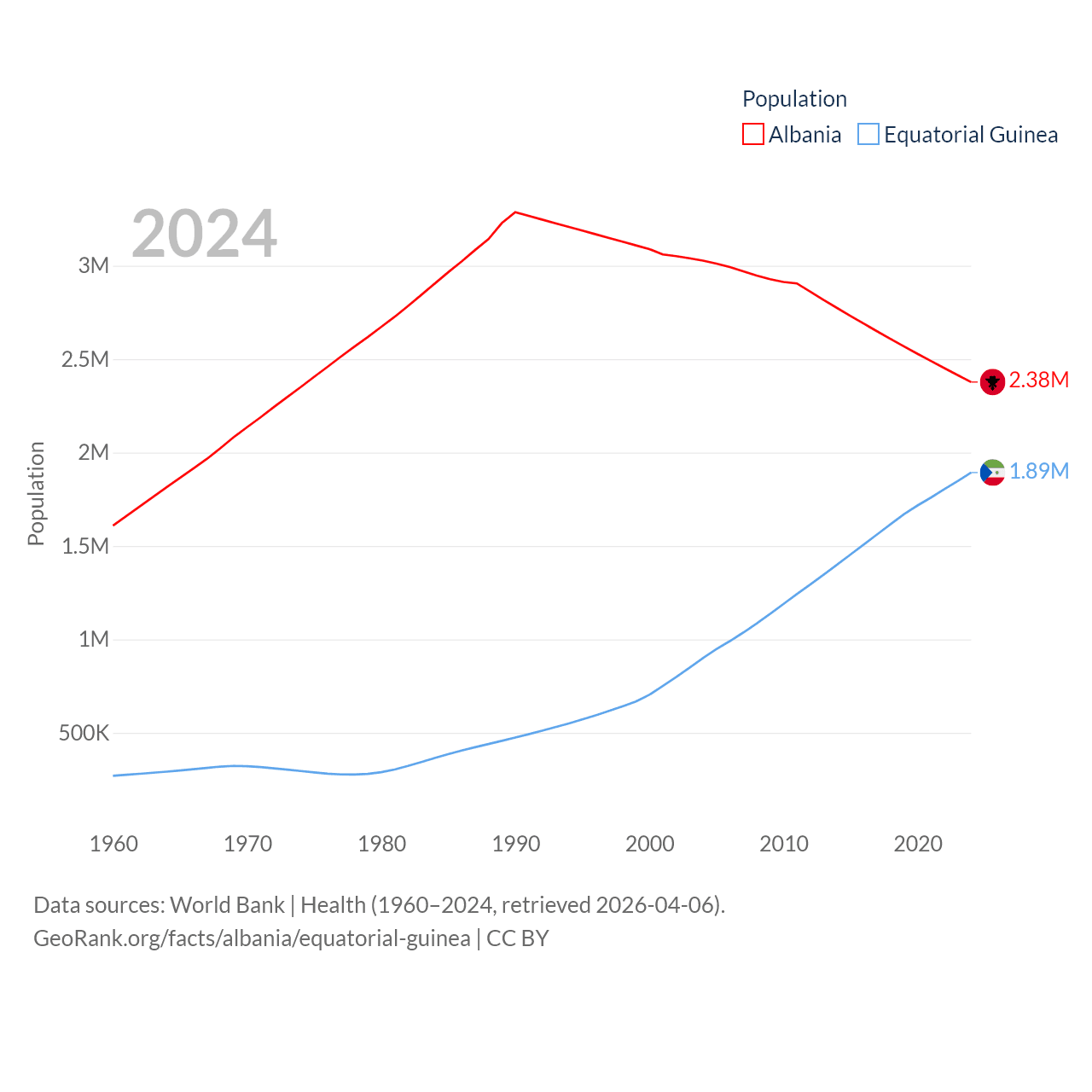 Albania has a population of 2.38M (ranked 144/197), compared with 1.89M in Equatorial Guinea (ranked 148/197). Albania's land area is 10,579 sq mi versus 10,830 sq mi for Equatorial Guinea (ranked 143rd vs. 140th).