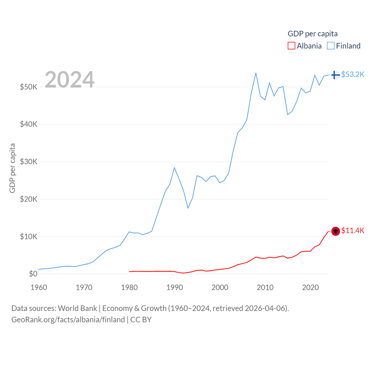 By GDP, Albania ranks 112/197 ($27B) and Finland ranks 47/197 ($299B). By GDP per capita, Albania ranks 82/197 ($11,378), while Finland ranks 23/197 ($53,150).