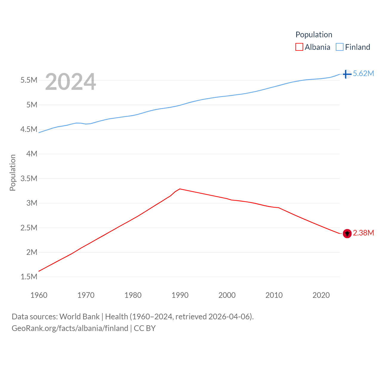 Albania has a population of 2.38M (ranked 144/197), compared with 5.62M in Finland (ranked 116/197). Albania's land area is 10,579 sq mi versus 117,360 sq mi for Finland (ranked 143rd vs. 70th).