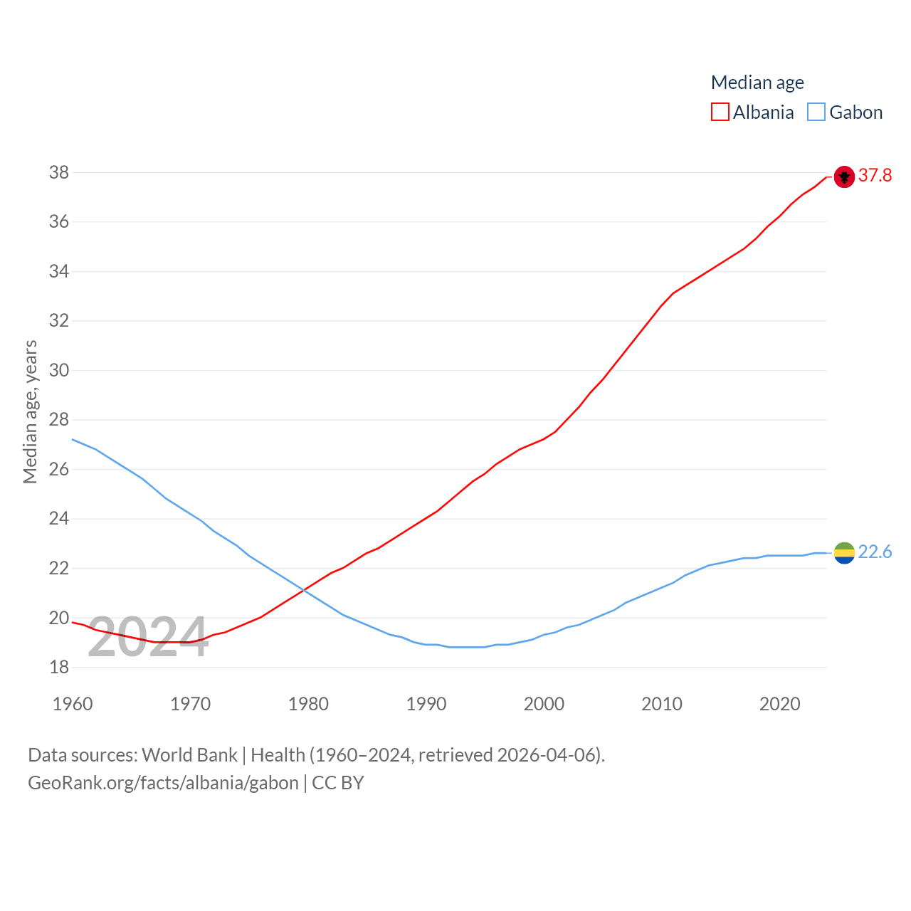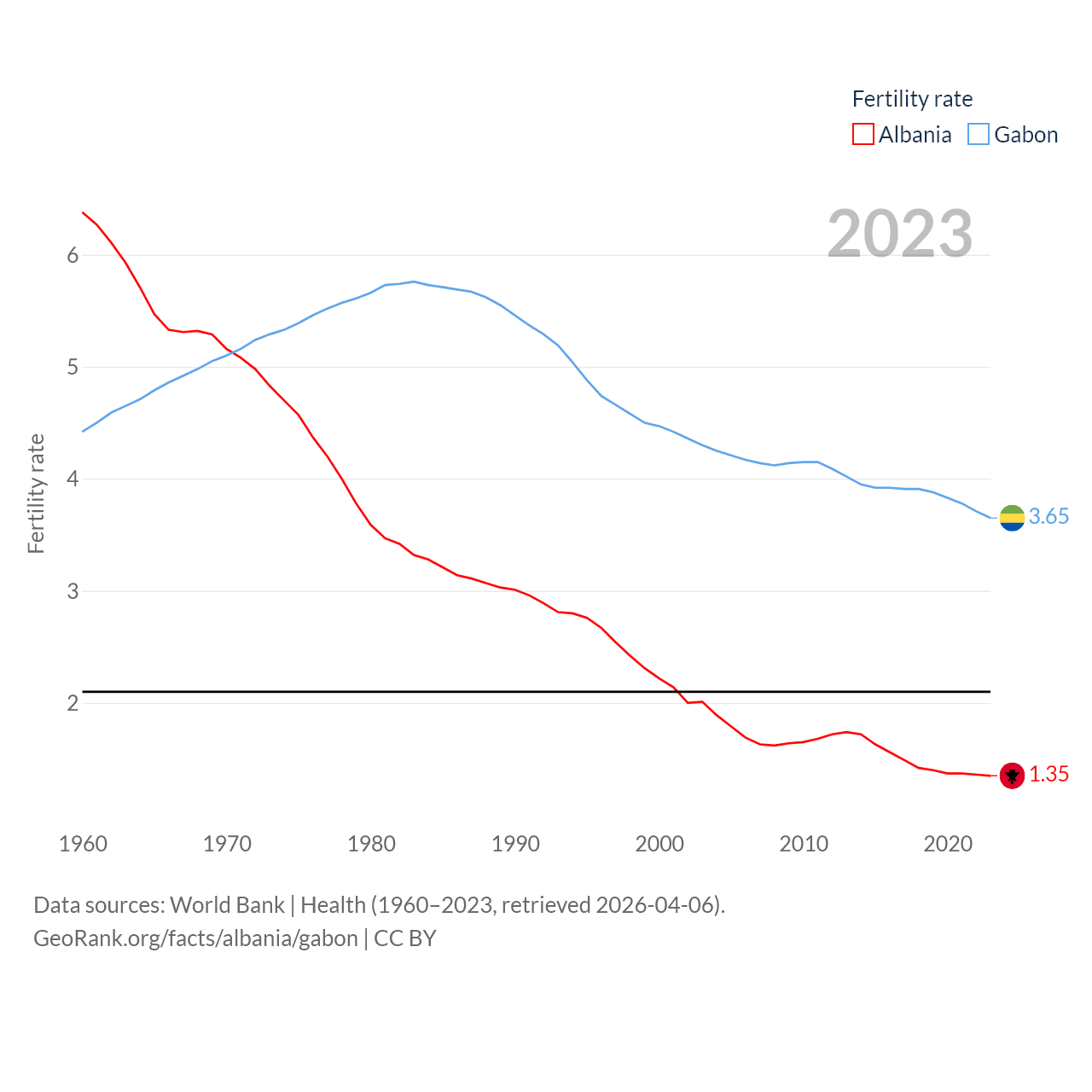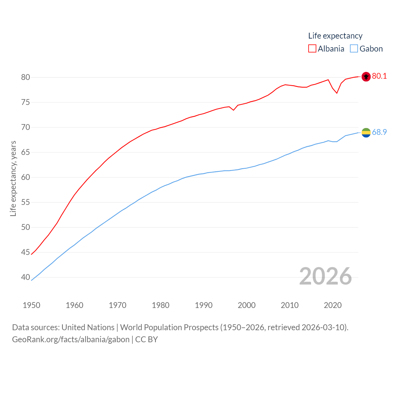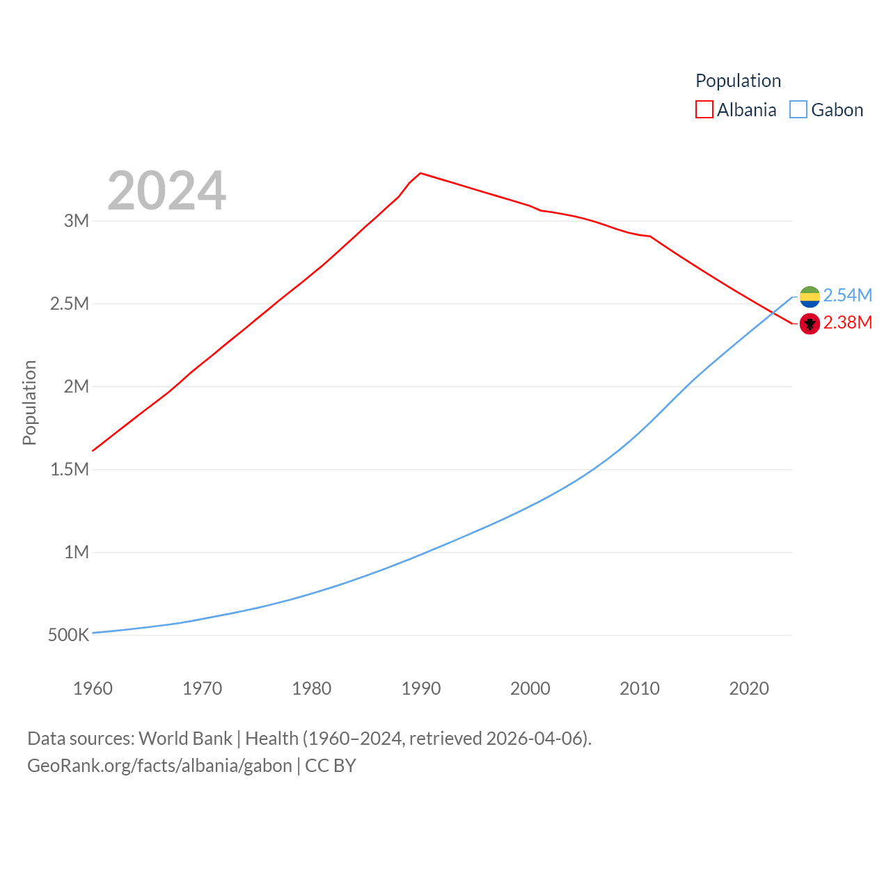 Albania has a population of 2.38M (ranked 144/197), compared with 2.54M in Gabon (ranked 141/197). Albania's land area is 10,579 sq mi versus 99,487 sq mi for Gabon (ranked 143rd vs. 75th).