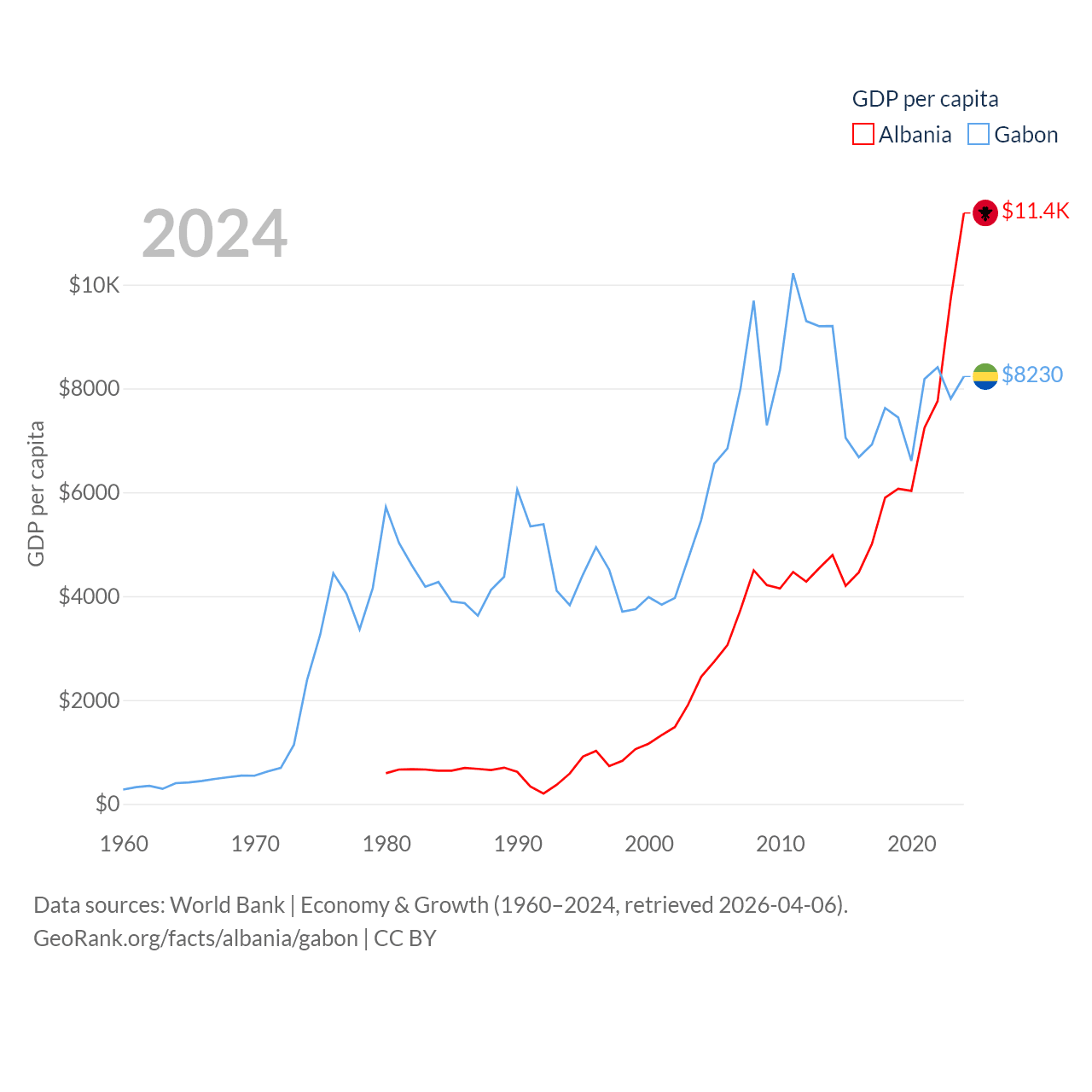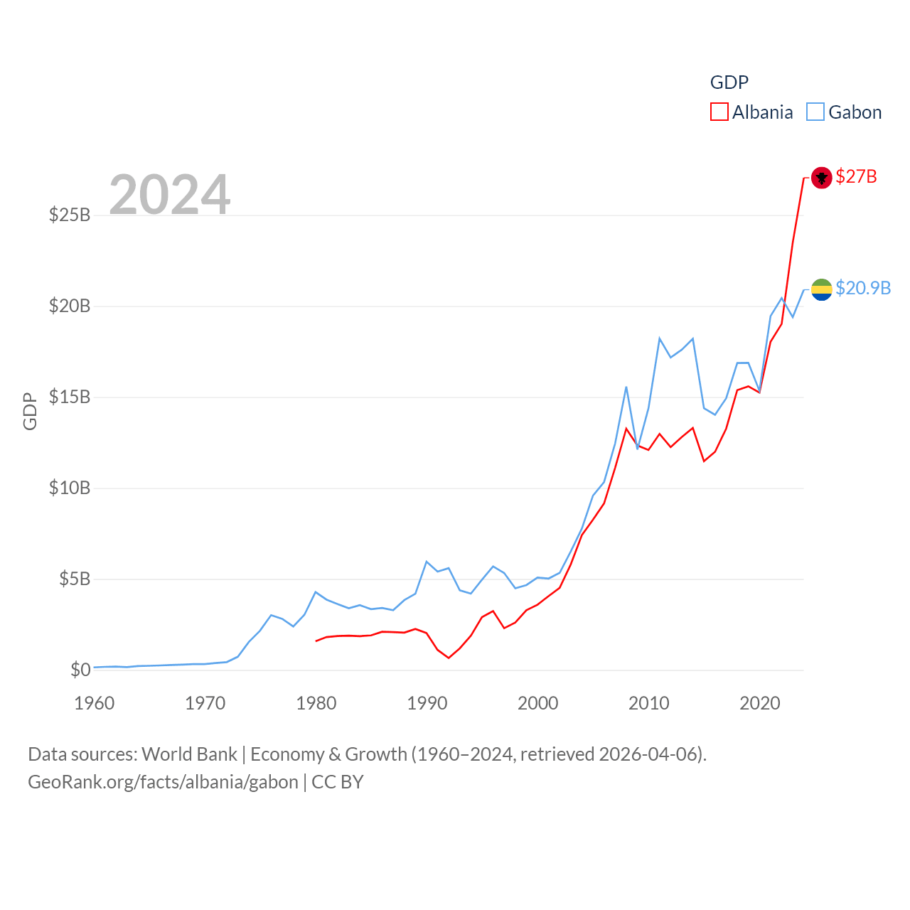 By GDP, Albania ranks 112/197 ($27B) and Gabon ranks 127/197 ($20.9B). By GDP per capita, Albania ranks 82/197 ($11,378), while Gabon ranks 93/197 ($8,230).
