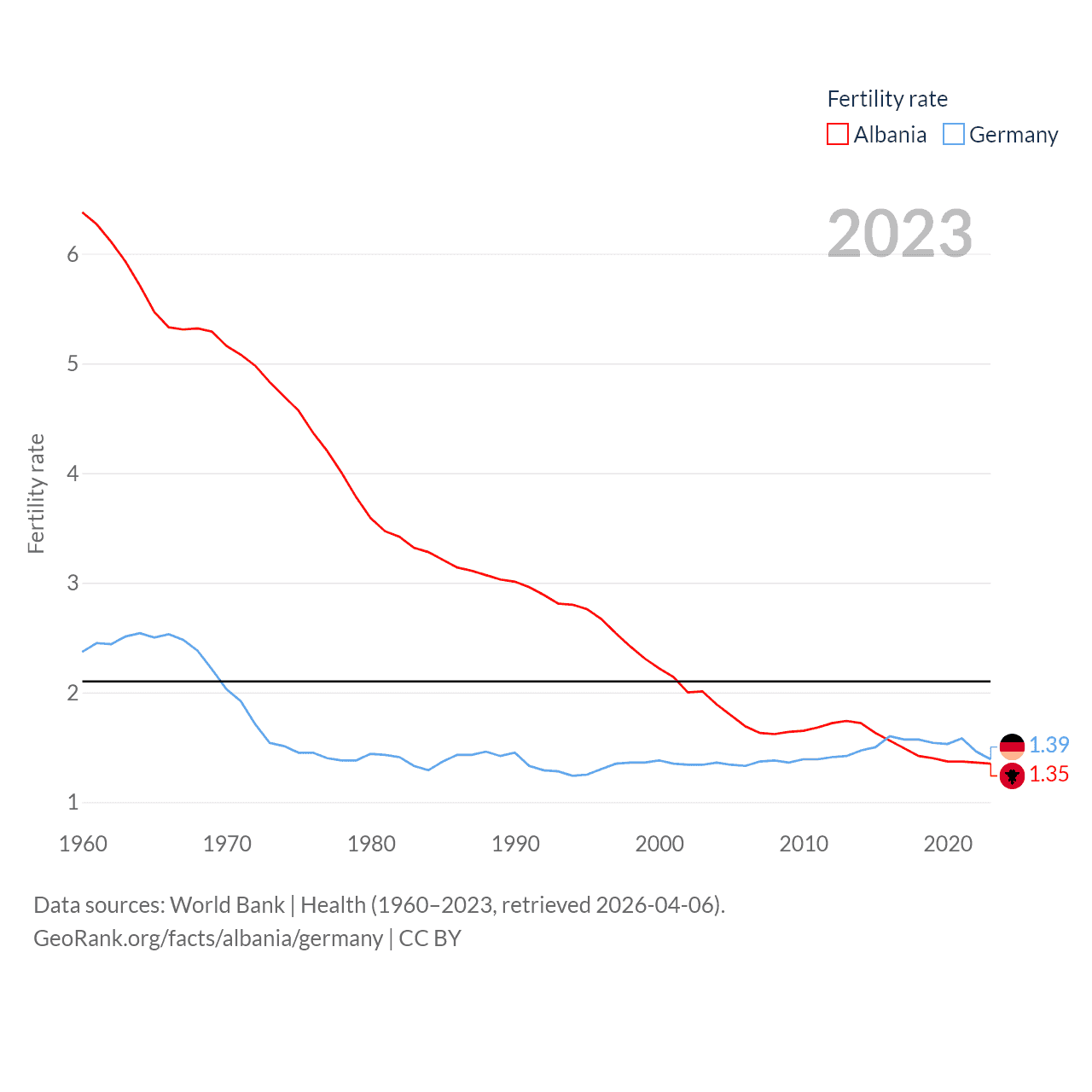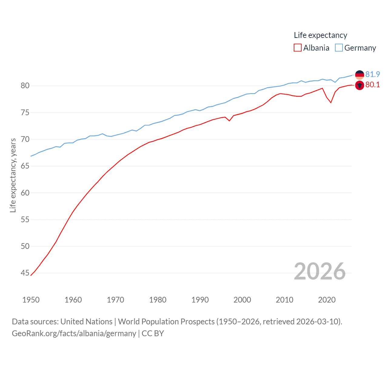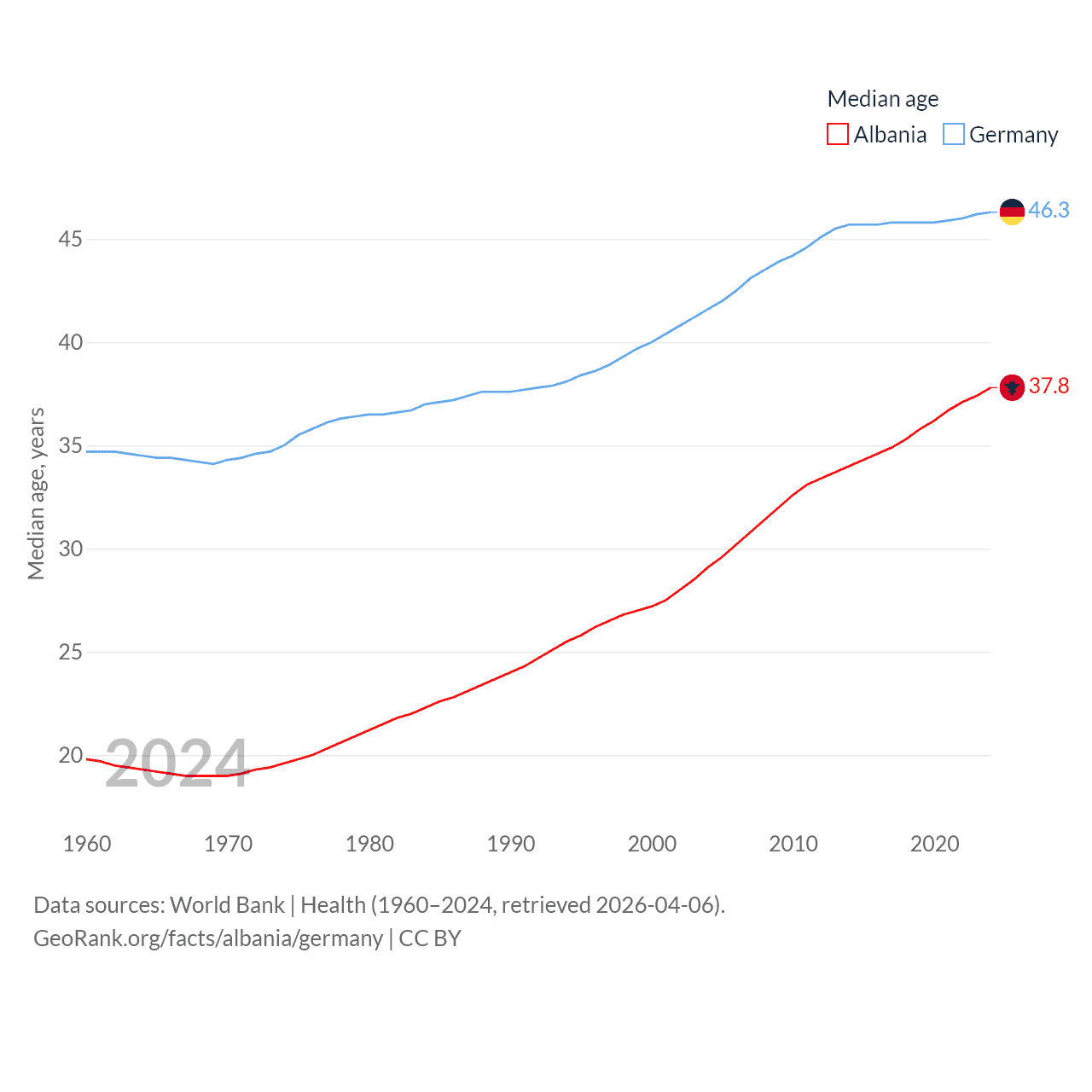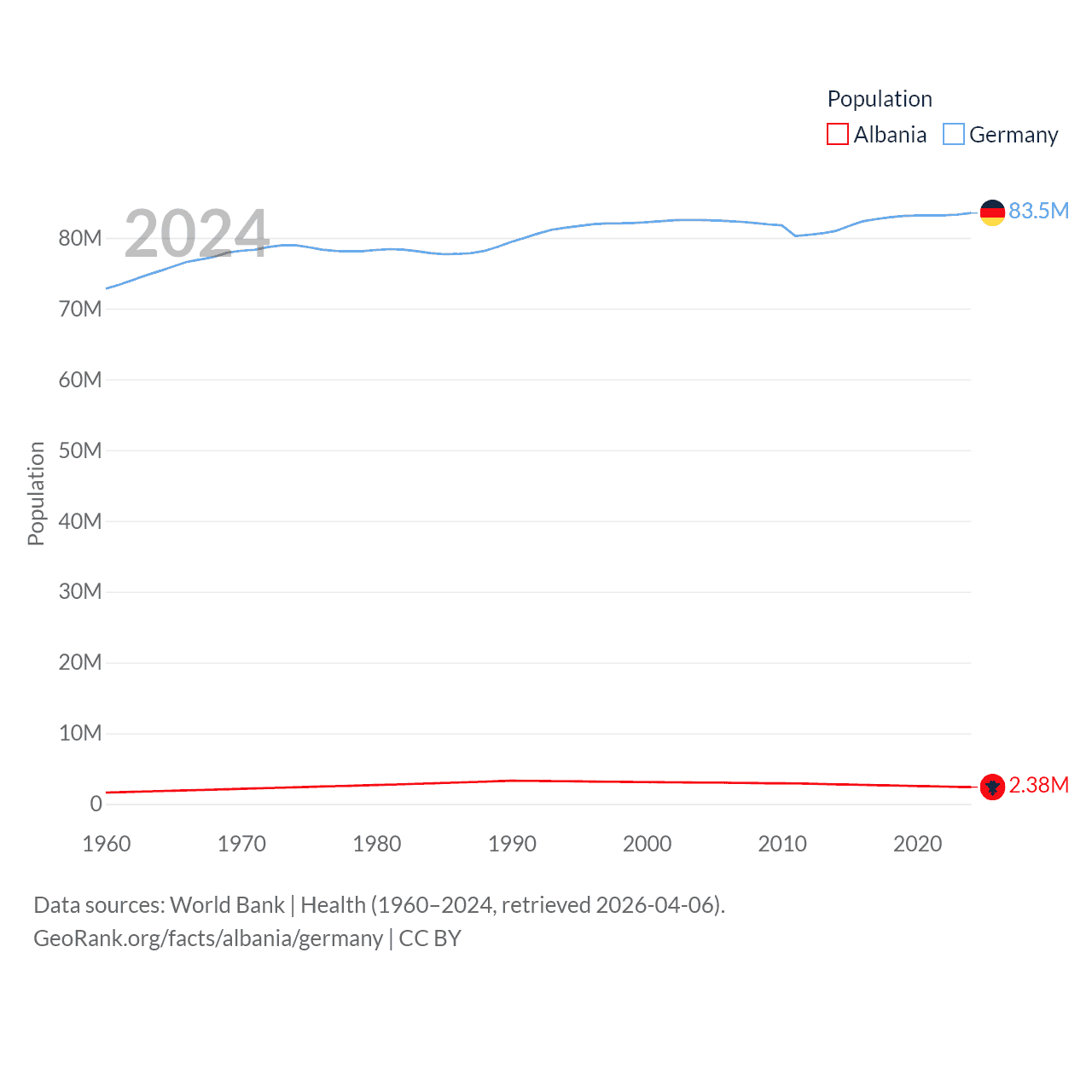 Albania has a population of 2.38M (ranked 144/197), compared with 83.5M in Germany (ranked 19/197). Albania's land area is 10,579 sq mi versus 134,916 sq mi for Germany (ranked 143rd vs. 63rd).