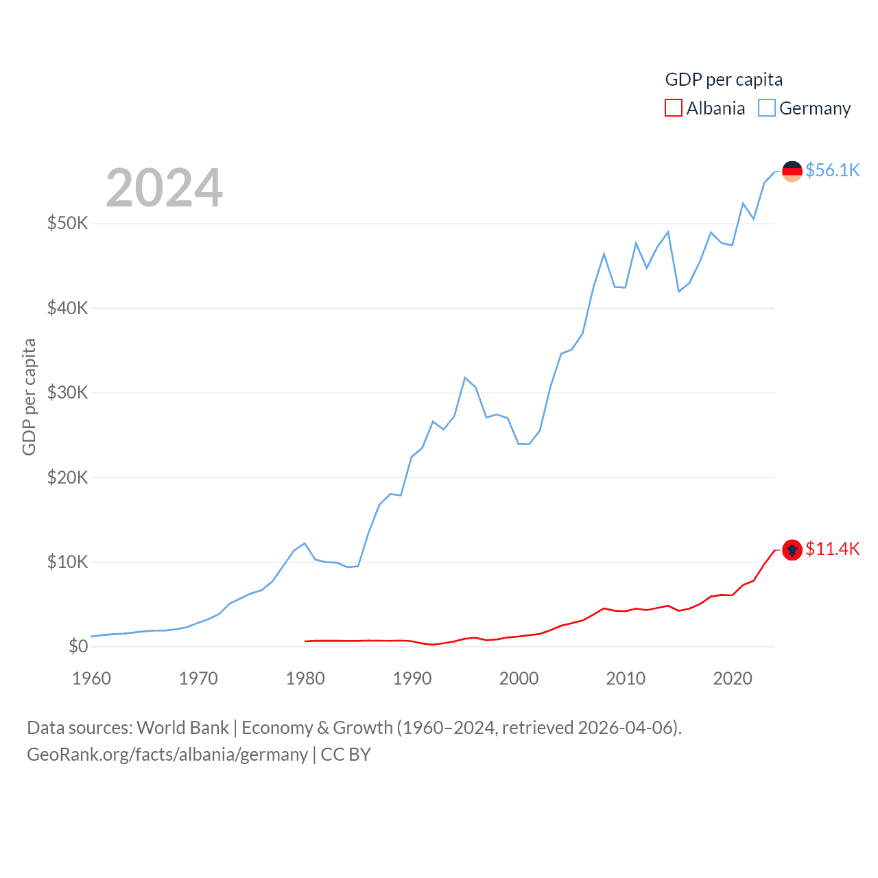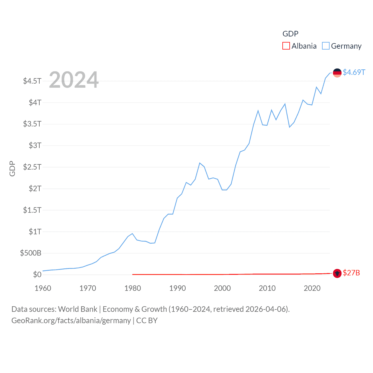 By GDP, Albania ranks 112/197 ($27B) and Germany ranks 3/197 ($4.69T). By GDP per capita, Albania ranks 82/197 ($11,378), while Germany ranks 19/197 ($56,104).