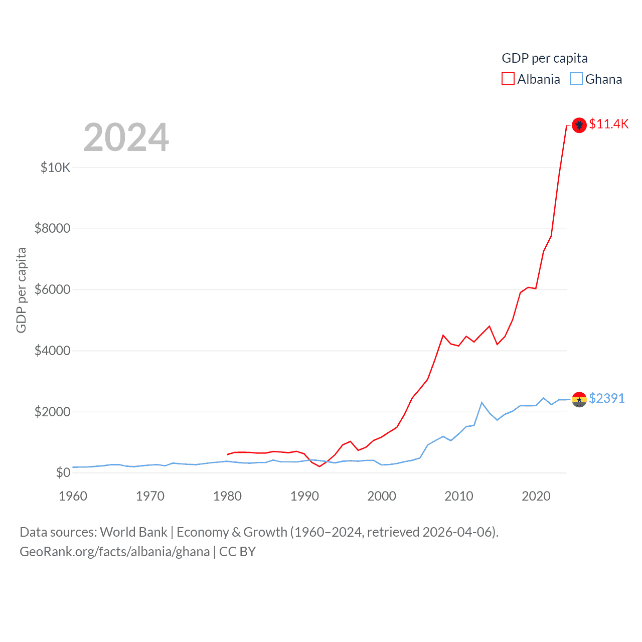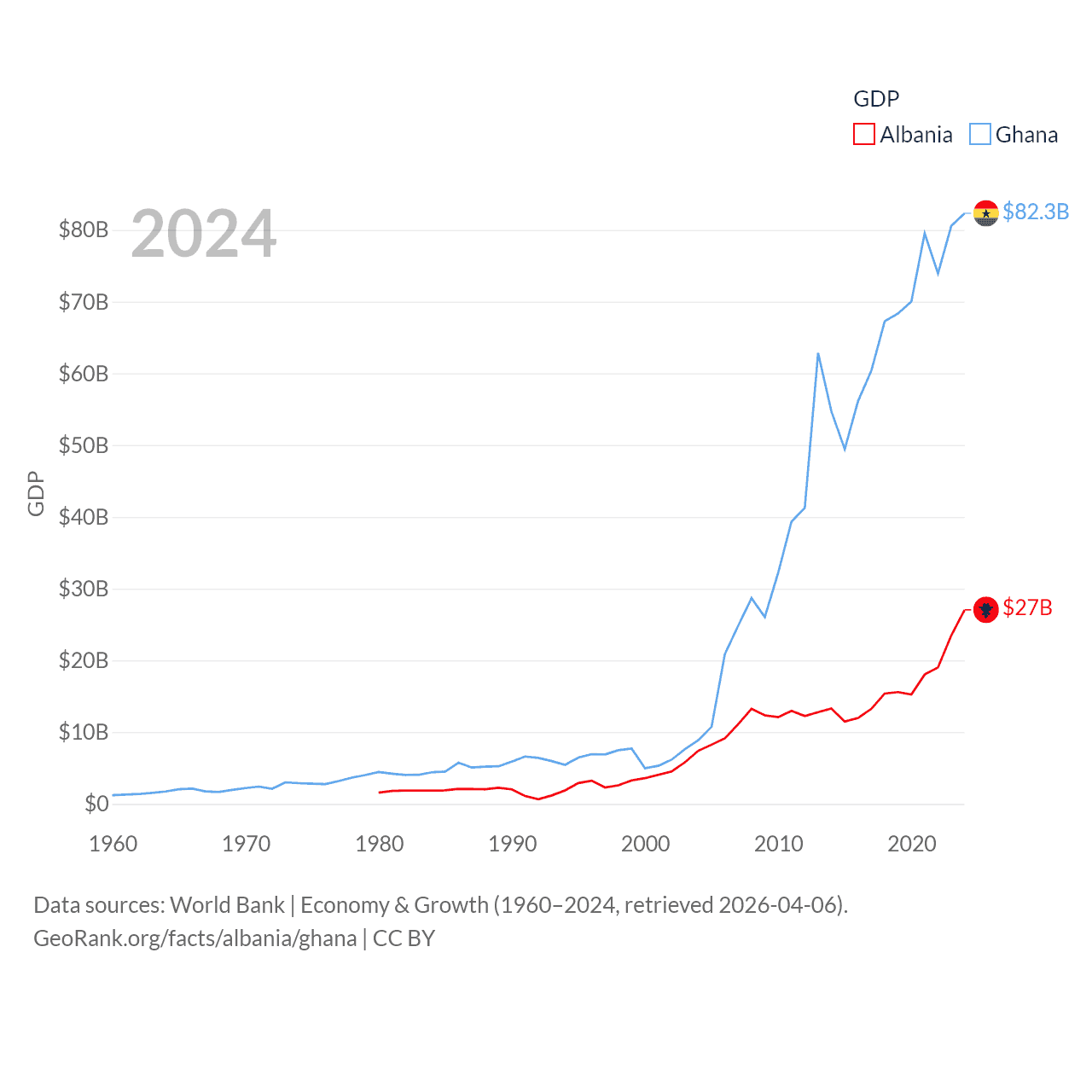By GDP, Albania ranks 112/197 ($27B) and Ghana ranks 80/197 ($82.3B). By GDP per capita, Albania ranks 82/197 ($11,378), while Ghana ranks 151/197 ($2,391).