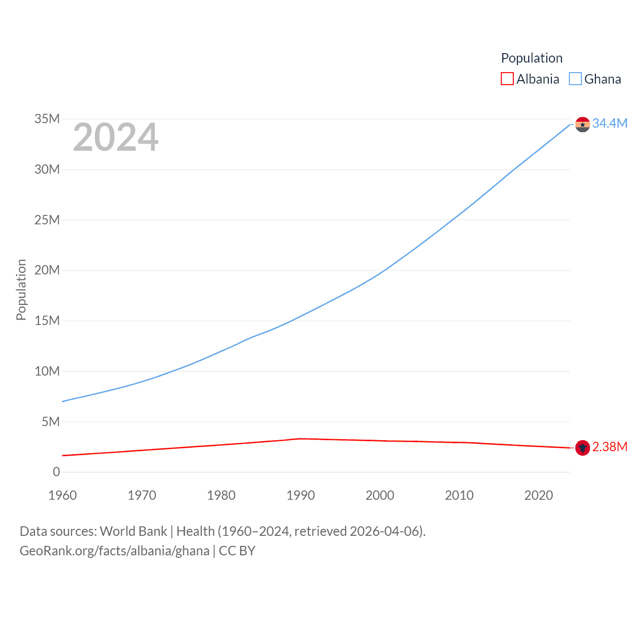 Albania has a population of 2.38M (ranked 144/197), compared with 34.4M in Ghana (ranked 47/197). Albania's land area is 10,579 sq mi versus 87,851 sq mi for Ghana (ranked 143rd vs. 81st).