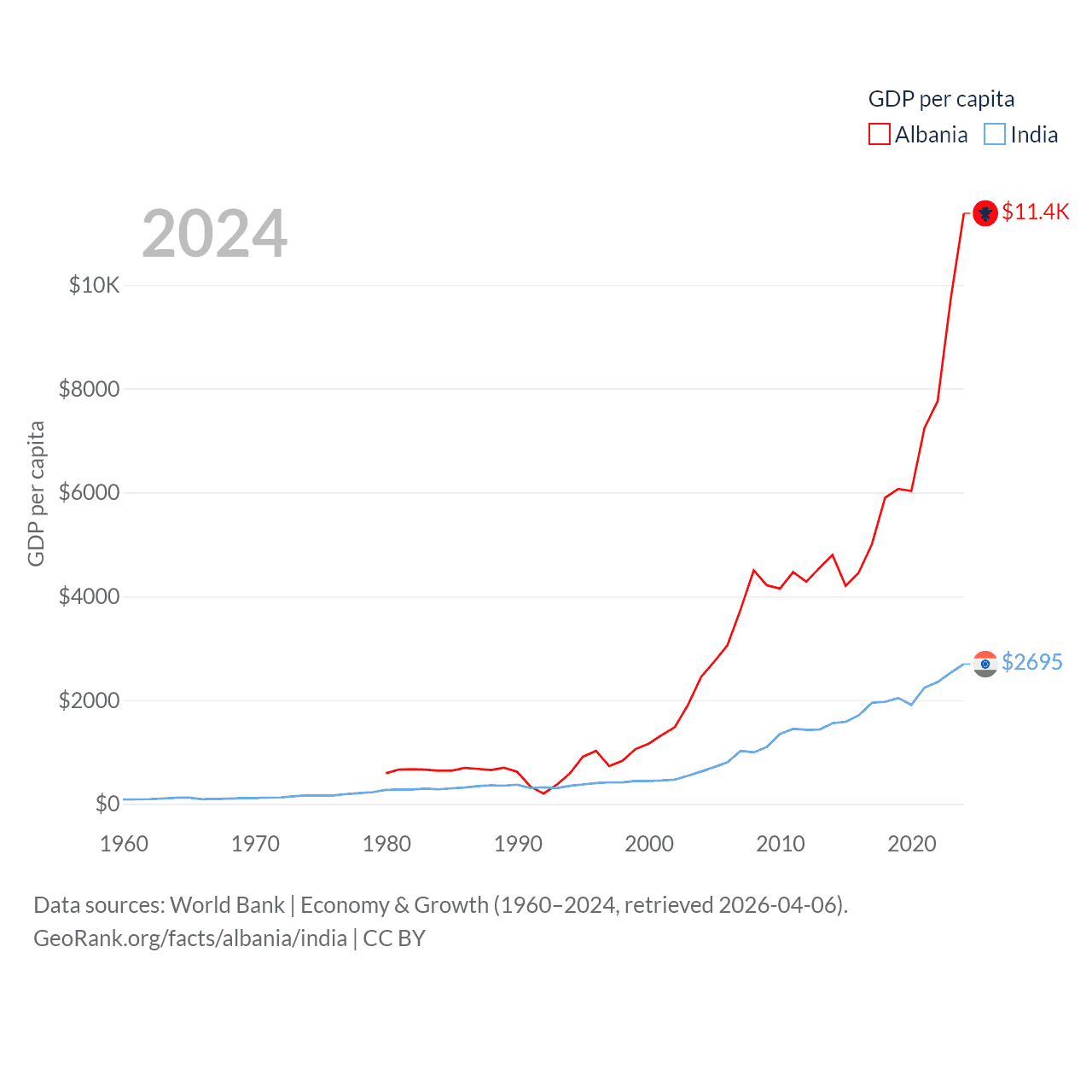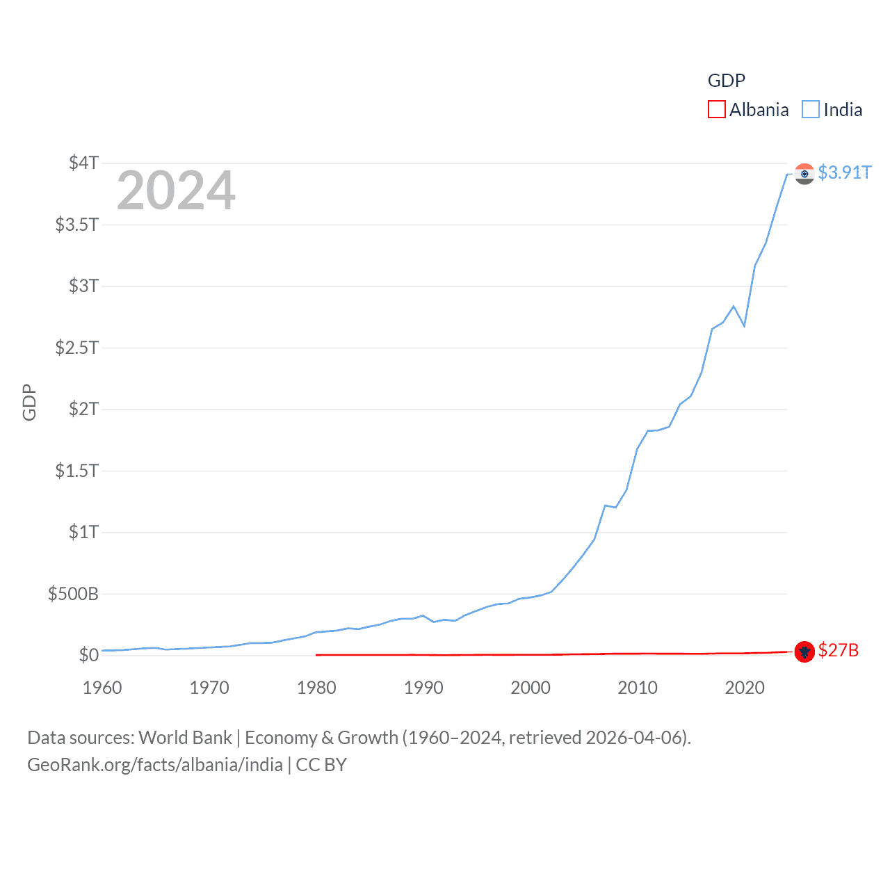 By GDP, Albania ranks 112/197 ($27B) and India ranks 5/197 ($3.91T). By GDP per capita, Albania ranks 82/197 ($11,378), while India ranks 143/197 ($2,695).