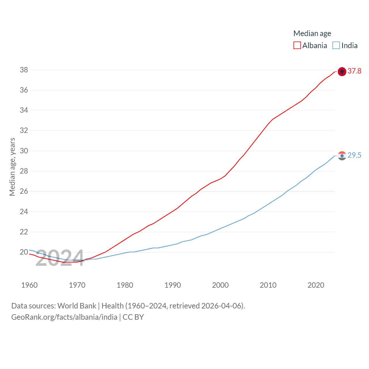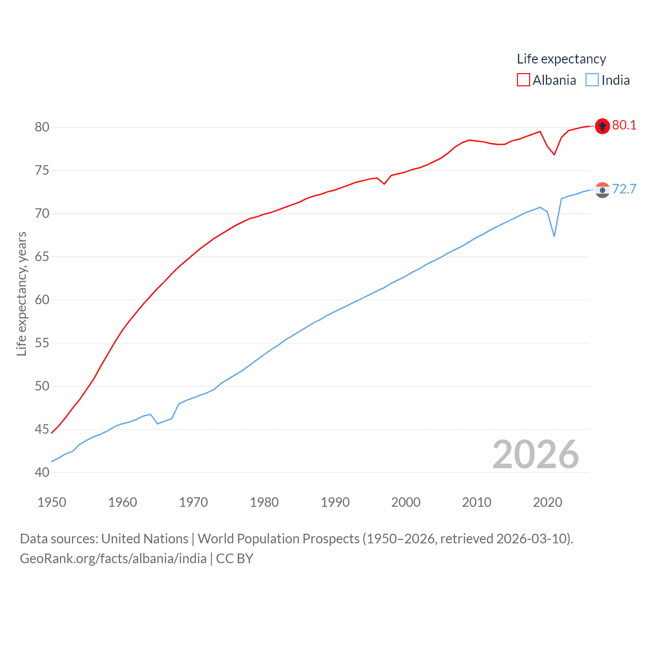 Albania has a population of 2.38M (ranked 144/197), compared with 1.45B in India (ranked 1/197). Albania's land area is 10,579 sq mi versus 1,147,955 sq mi for India (ranked 143rd vs. 7th).