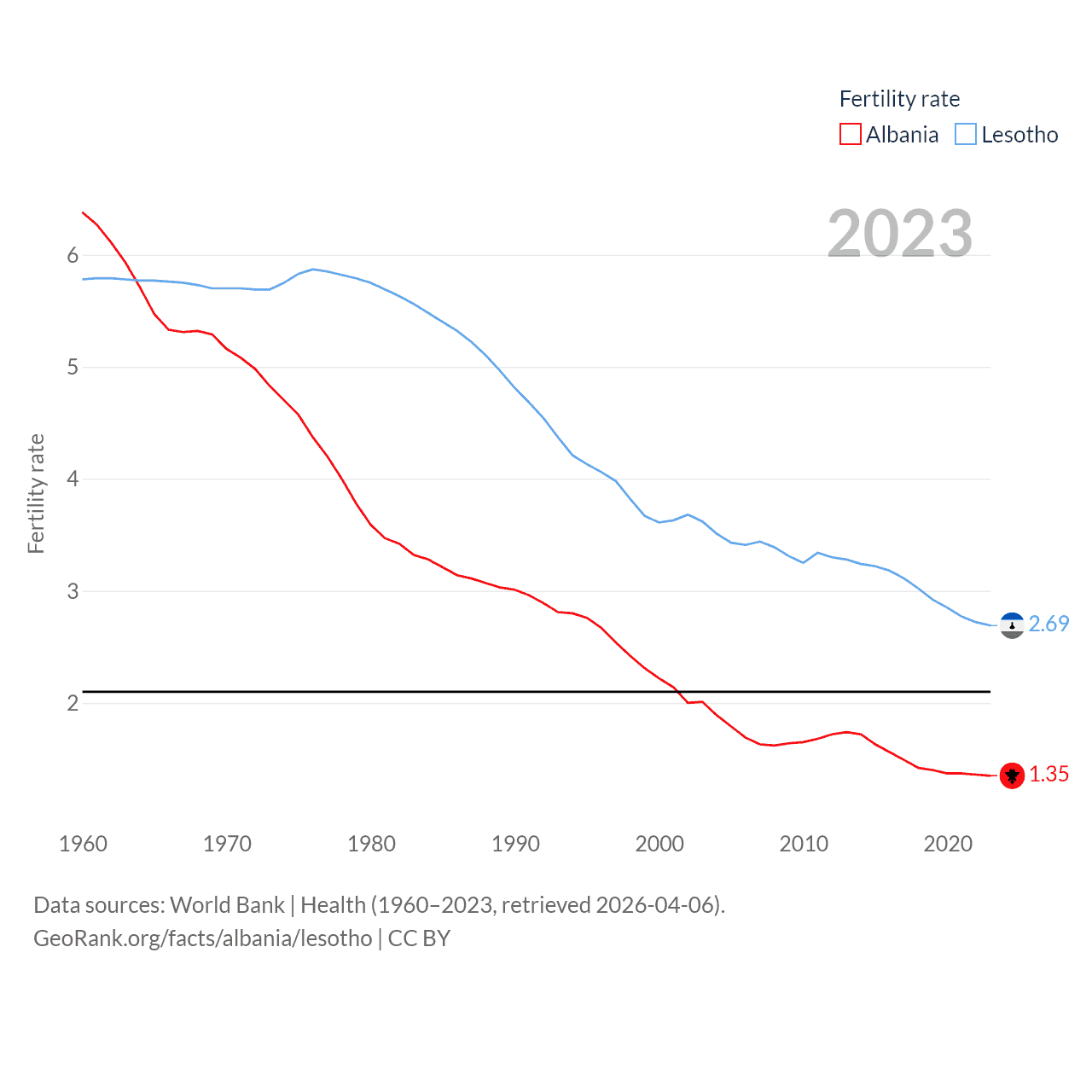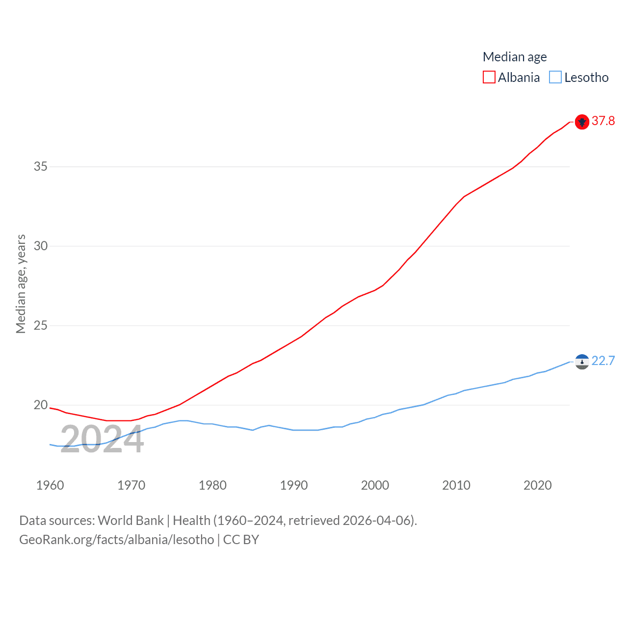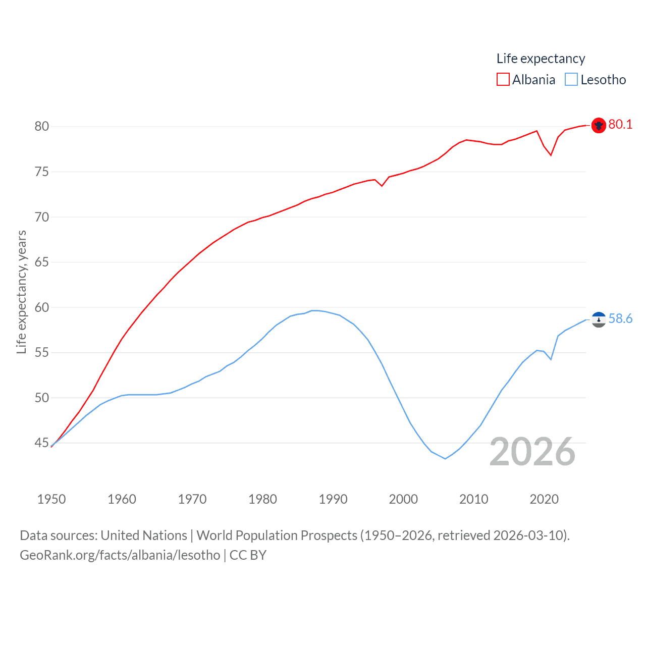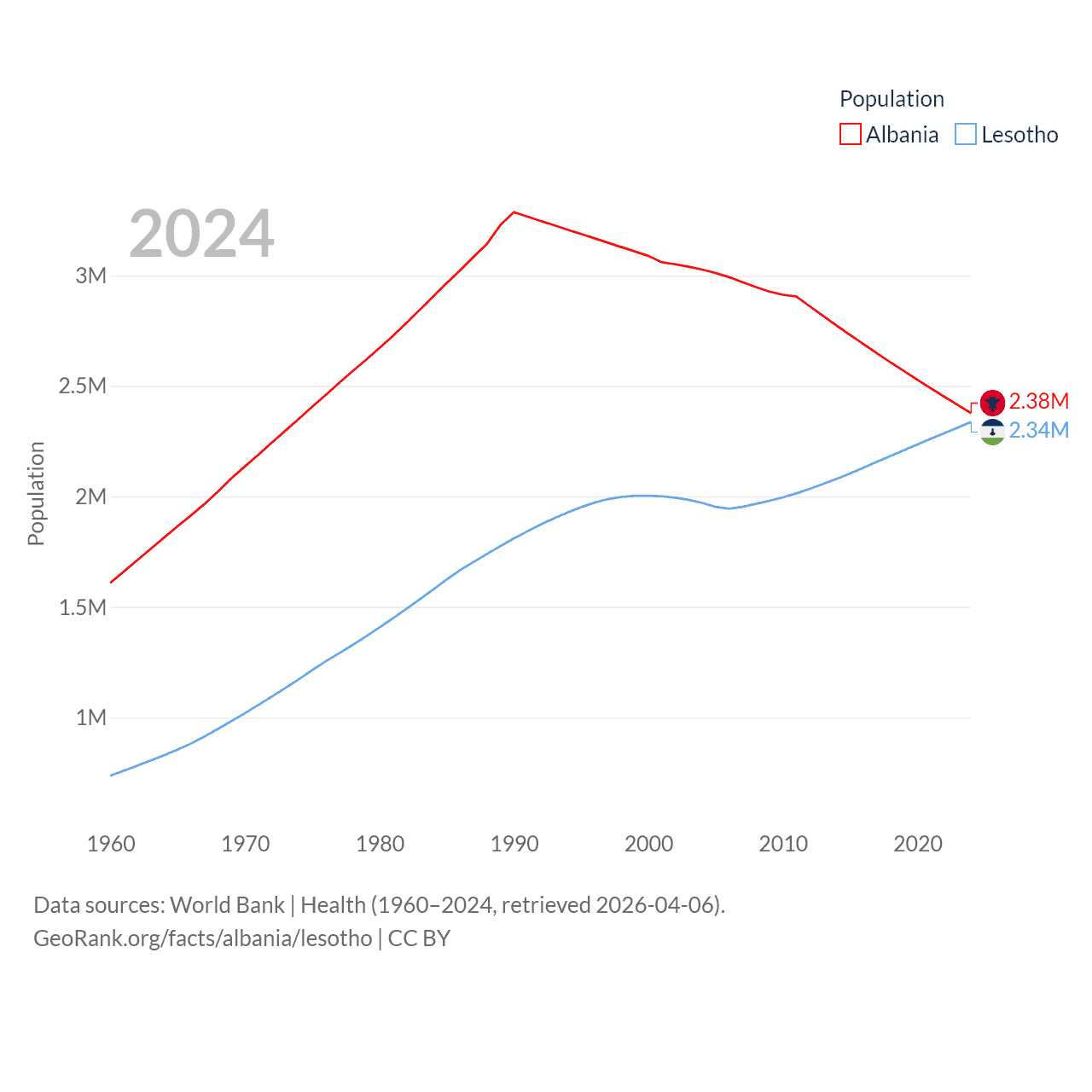 Albania has a population of 2.38M (ranked 144/197), compared with 2.34M in Lesotho (ranked 145/197). Albania's land area is 10,579 sq mi versus 11,722 sq mi for Lesotho (ranked 143rd vs. 137th).