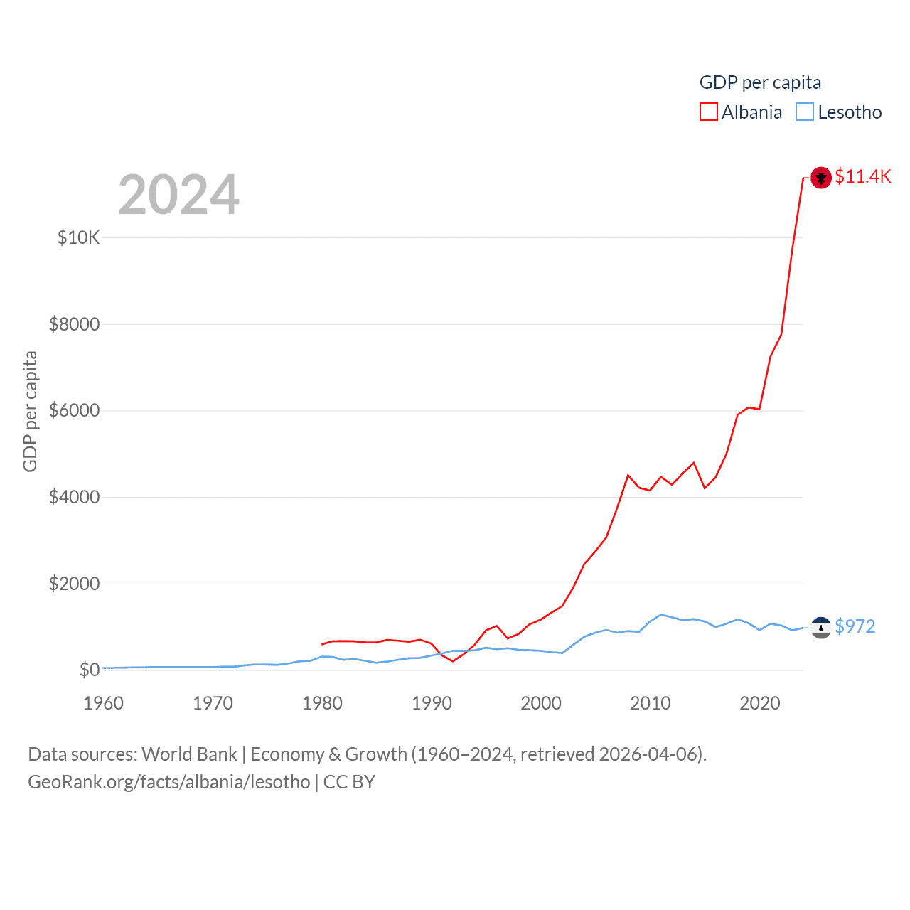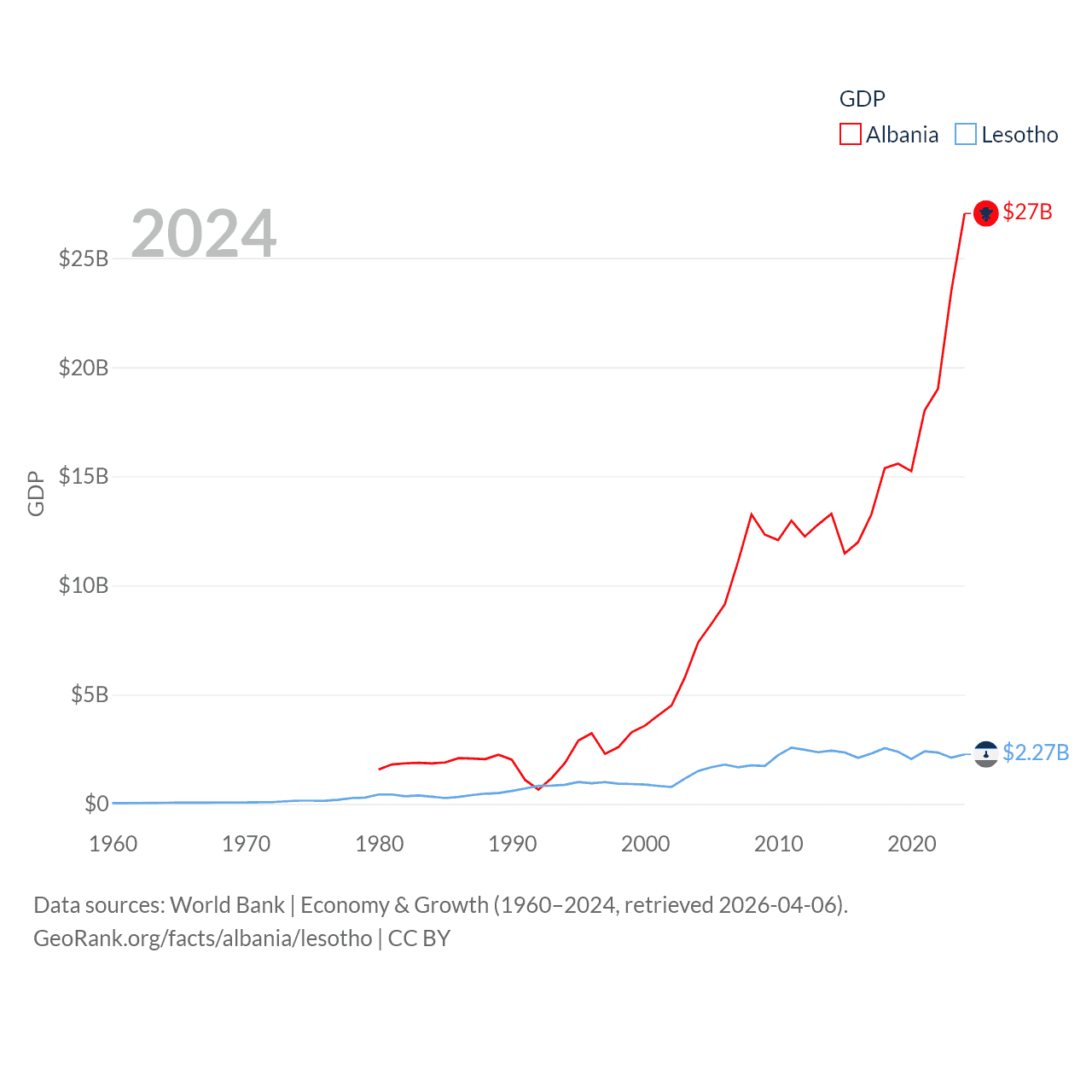 By GDP, Albania ranks 112/197 ($27B) and Lesotho ranks 175/197 ($2.27B). By GDP per capita, Albania ranks 82/197 ($11,378), while Lesotho ranks 181/197 ($972).
