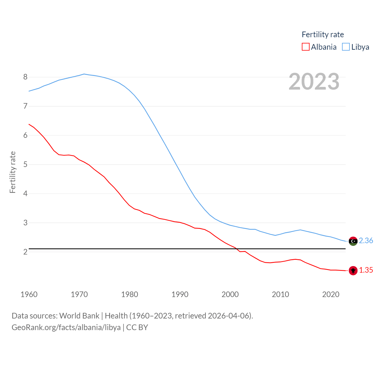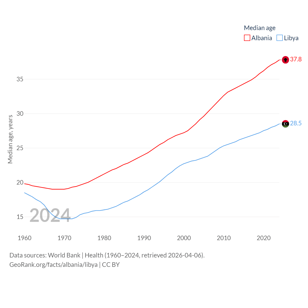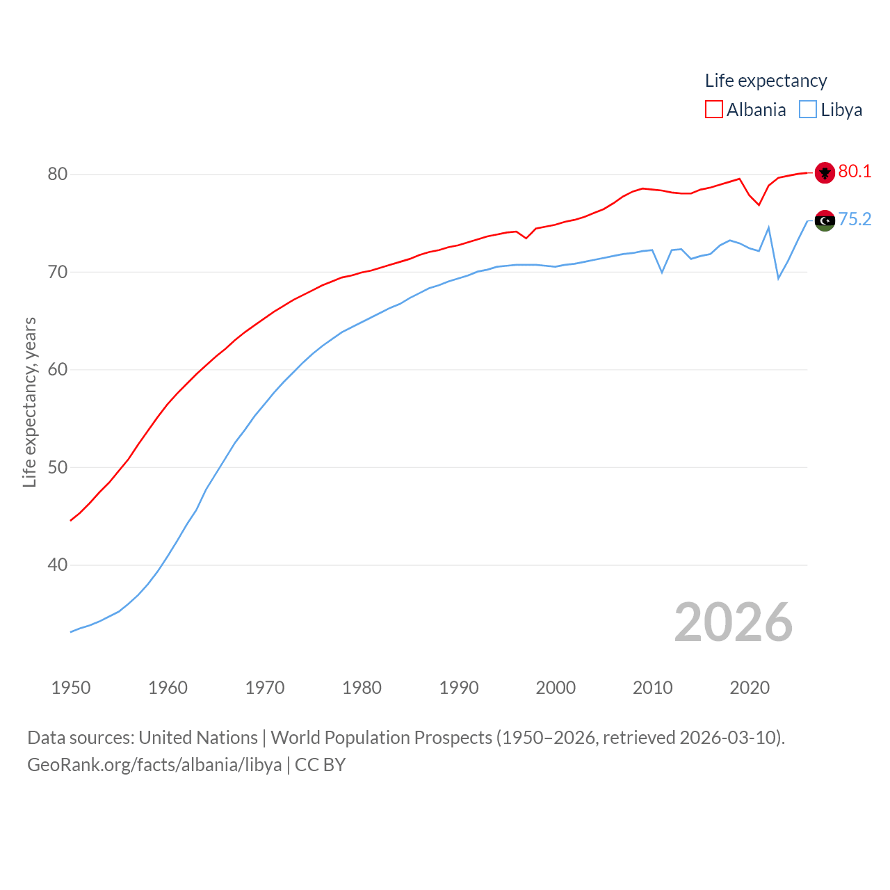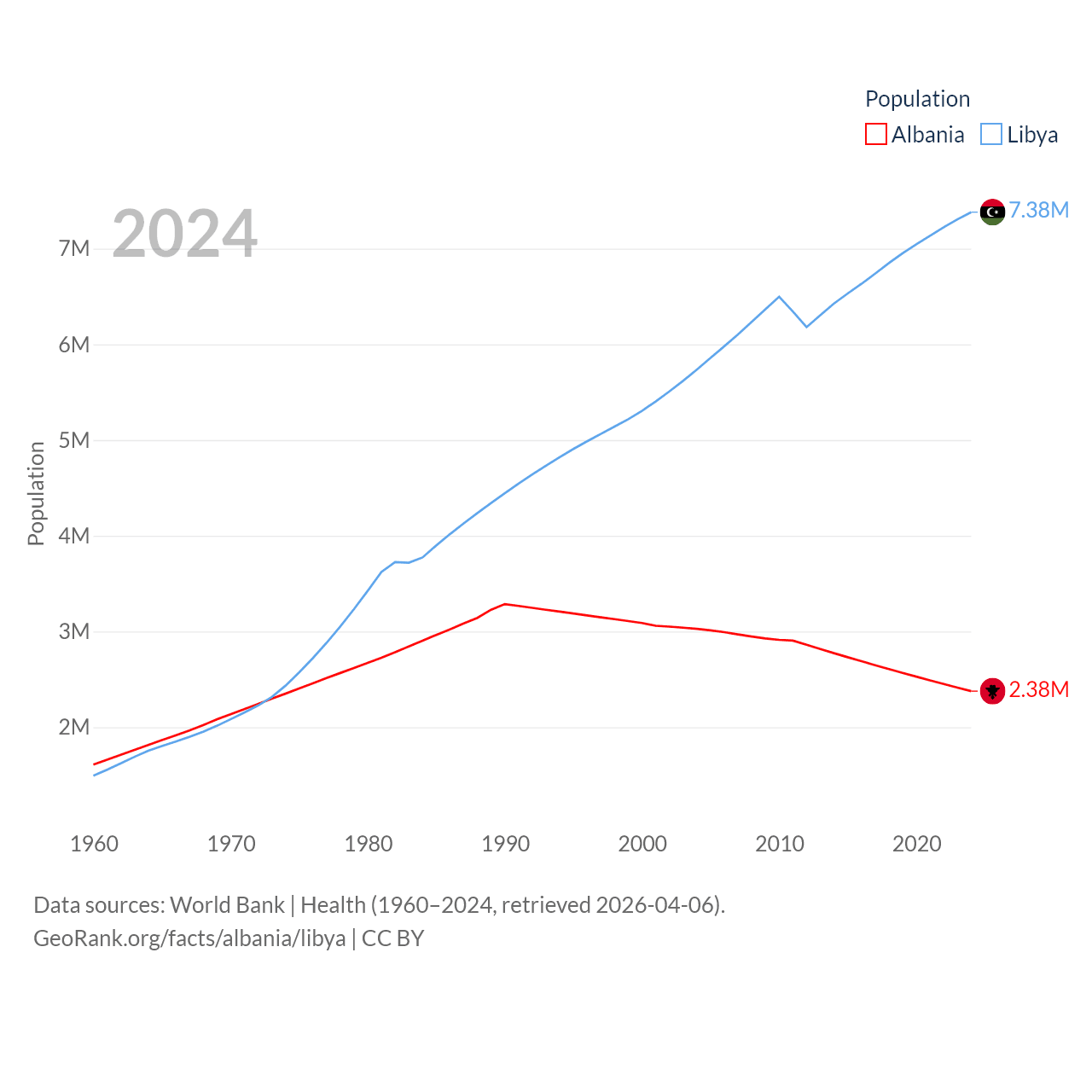 Albania has a population of 2.38M (ranked 144/197), compared with 7.38M in Libya (ranked 105/197). Albania's land area is 10,579 sq mi versus 679,362 sq mi for Libya (ranked 143rd vs. 16th).