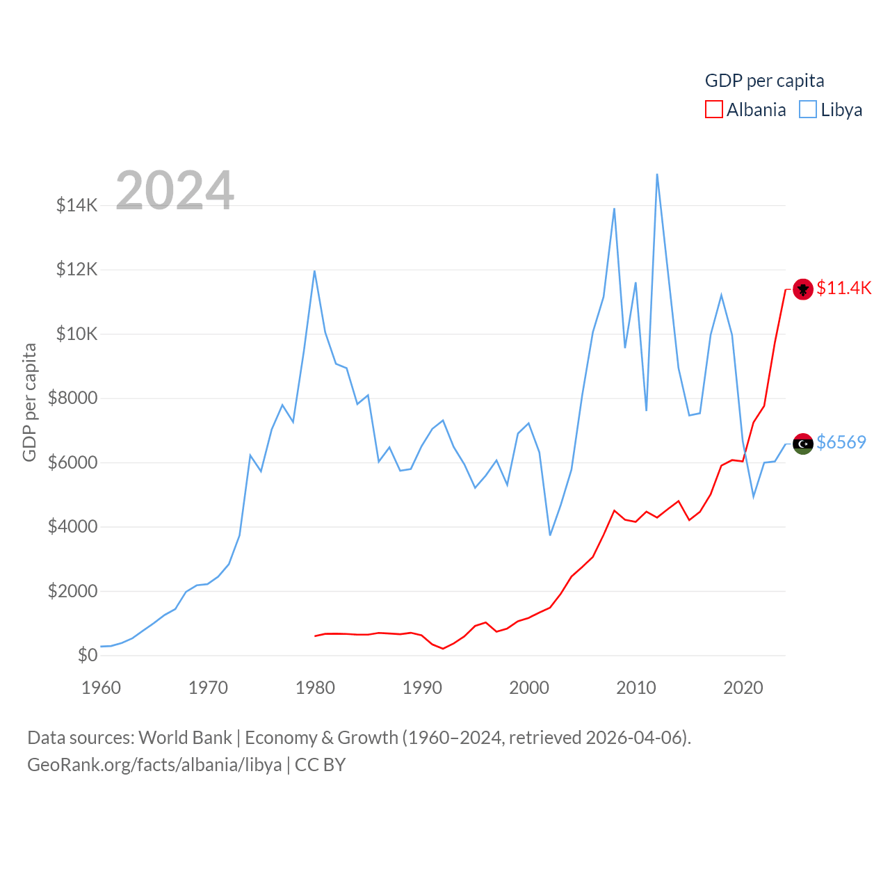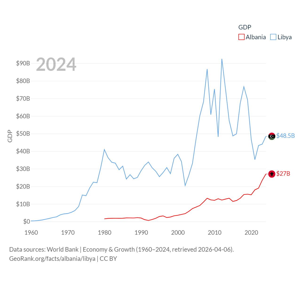 By GDP, Albania ranks 112/197 ($27B) and Libya ranks 95/197 ($48.5B). By GDP per capita, Albania ranks 82/197 ($11,378), while Libya ranks 107/197 ($6,569).