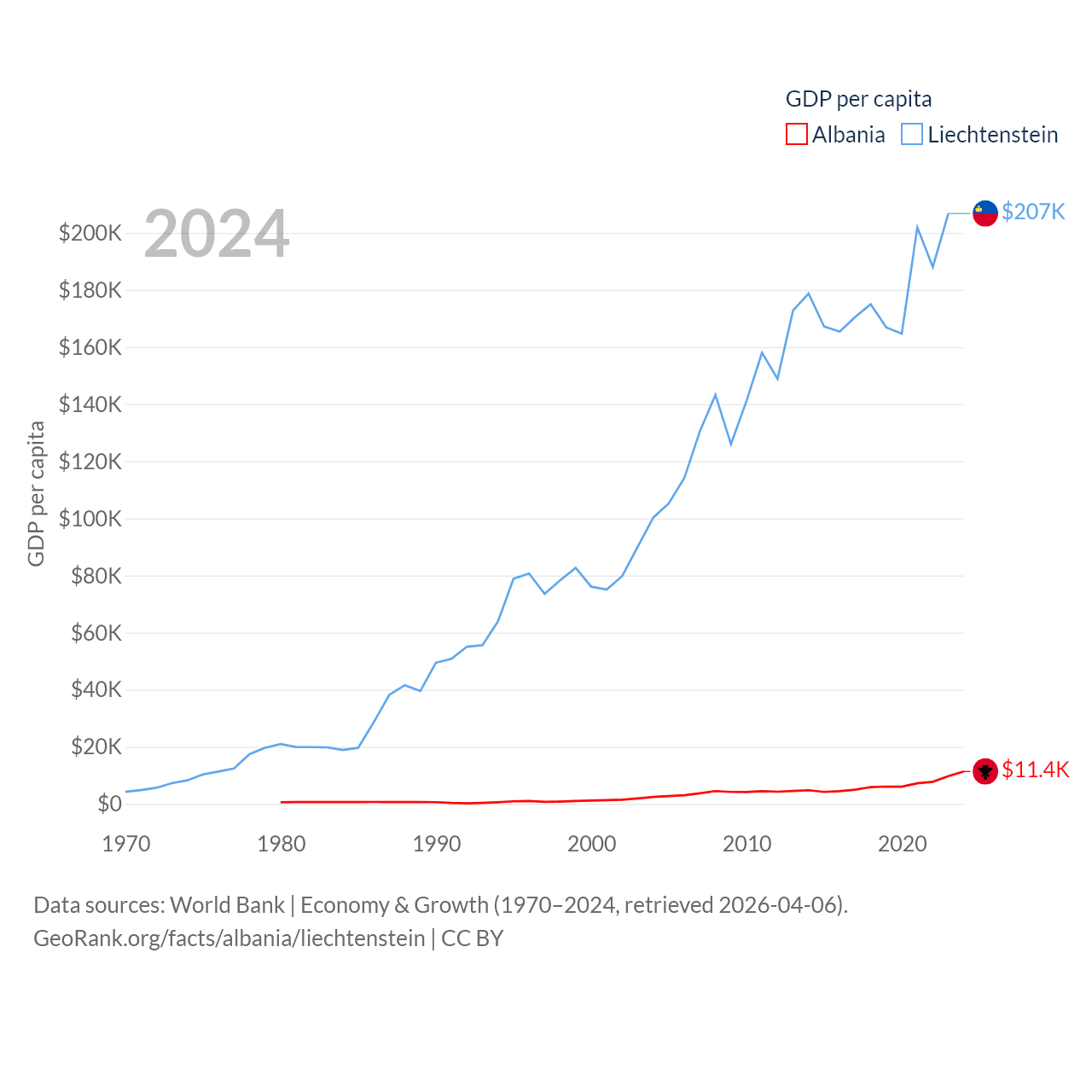 By GDP, Albania ranks 112/197 ($27B) and Liechtenstein ranks 156/197 ($8.24B). By GDP per capita, Albania ranks 82/197 ($11,378), while Liechtenstein ranks 2/197 ($206,781).