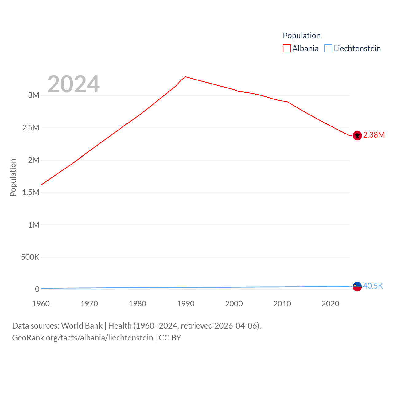 Albania has a population of 2.38M (ranked 144/197), compared with 40.4K in Liechtenstein (ranked 190/197). Albania's land area is 10,579 sq mi versus 61.8 sq mi for Liechtenstein (ranked 143rd vs. 192nd).