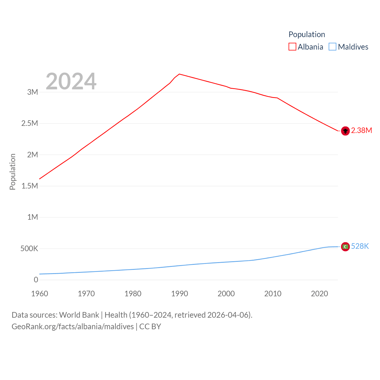Albania has a population of 2.38M (ranked 144/197), compared with 528K in Maldives (ranked 168/197). Albania's land area is 10,579 sq mi versus 115.1 sq mi for Maldives (ranked 143rd vs. 188th).