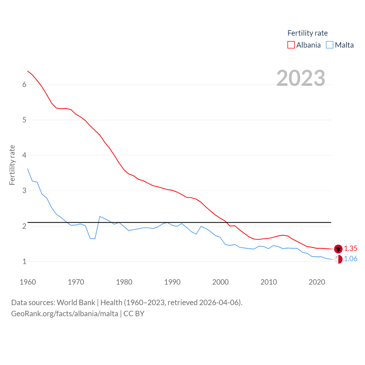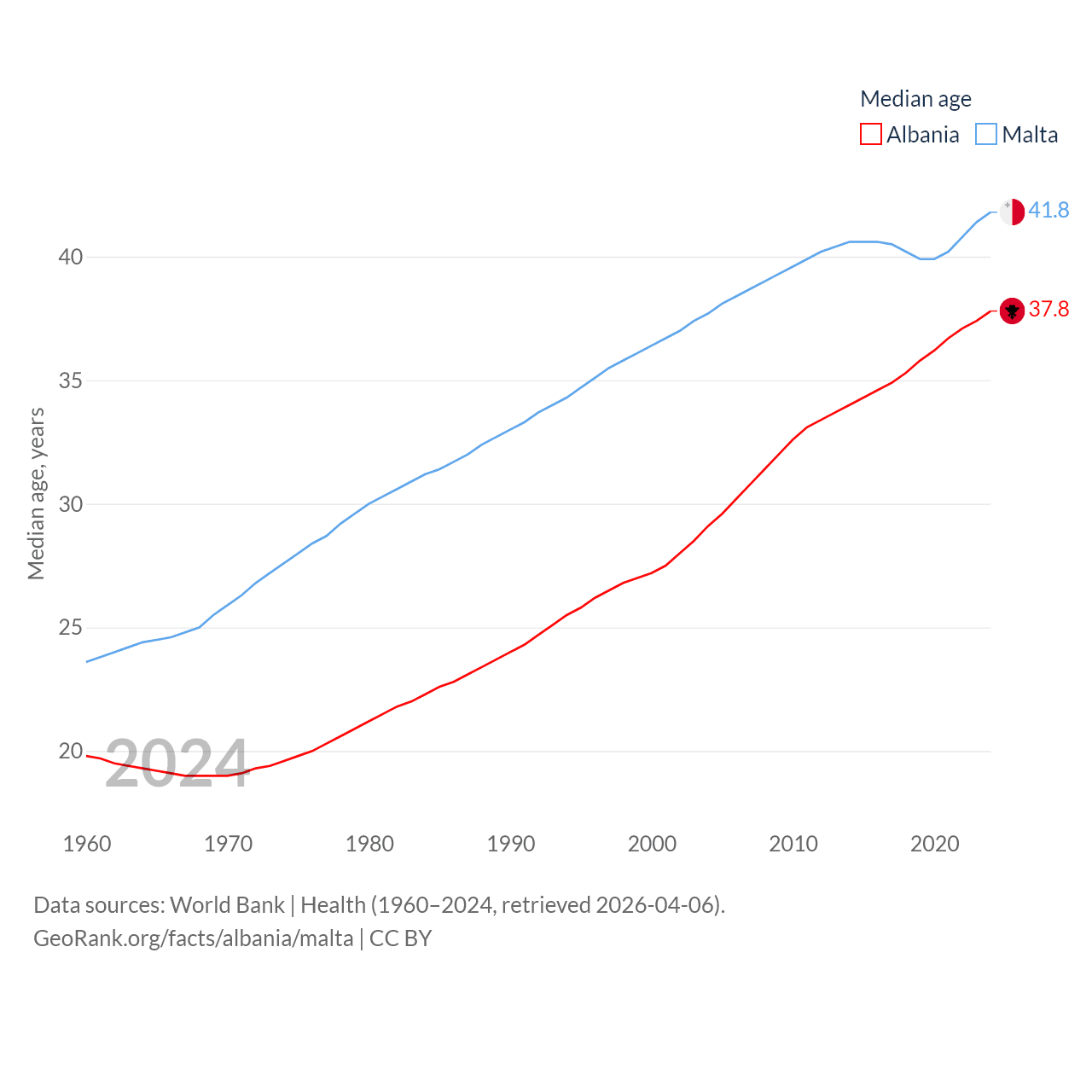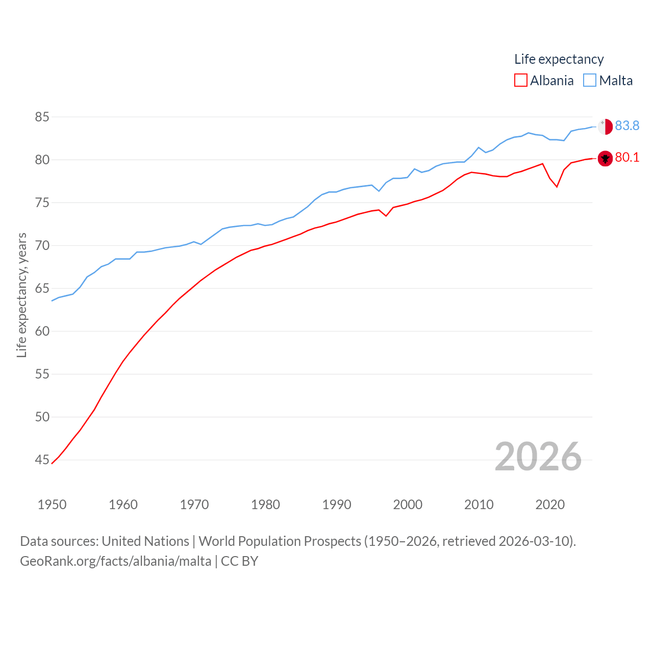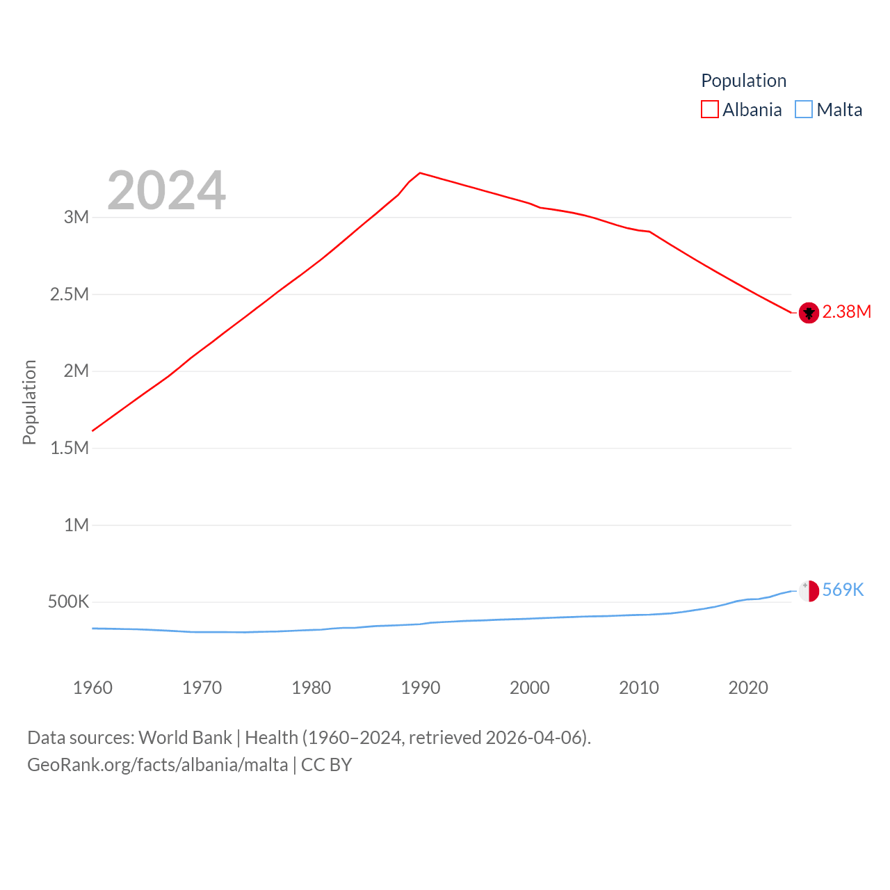 Albania has a population of 2.38M (ranked 144/197), compared with 569K in Malta (ranked 167/197). Albania's land area is 10,579 sq mi versus 123.6 sq mi for Malta (ranked 143rd vs. 187th).