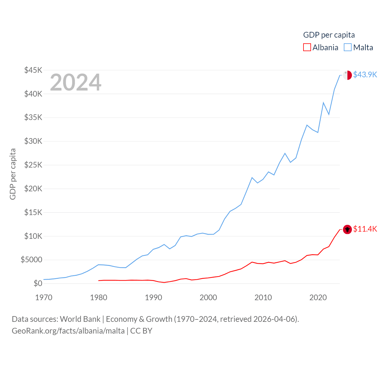 By GDP, Albania ranks 112/197 ($27B) and Malta ranks 119/197 ($25B). By GDP per capita, Albania ranks 82/197 ($11,378), while Malta ranks 28/197 ($43,899).