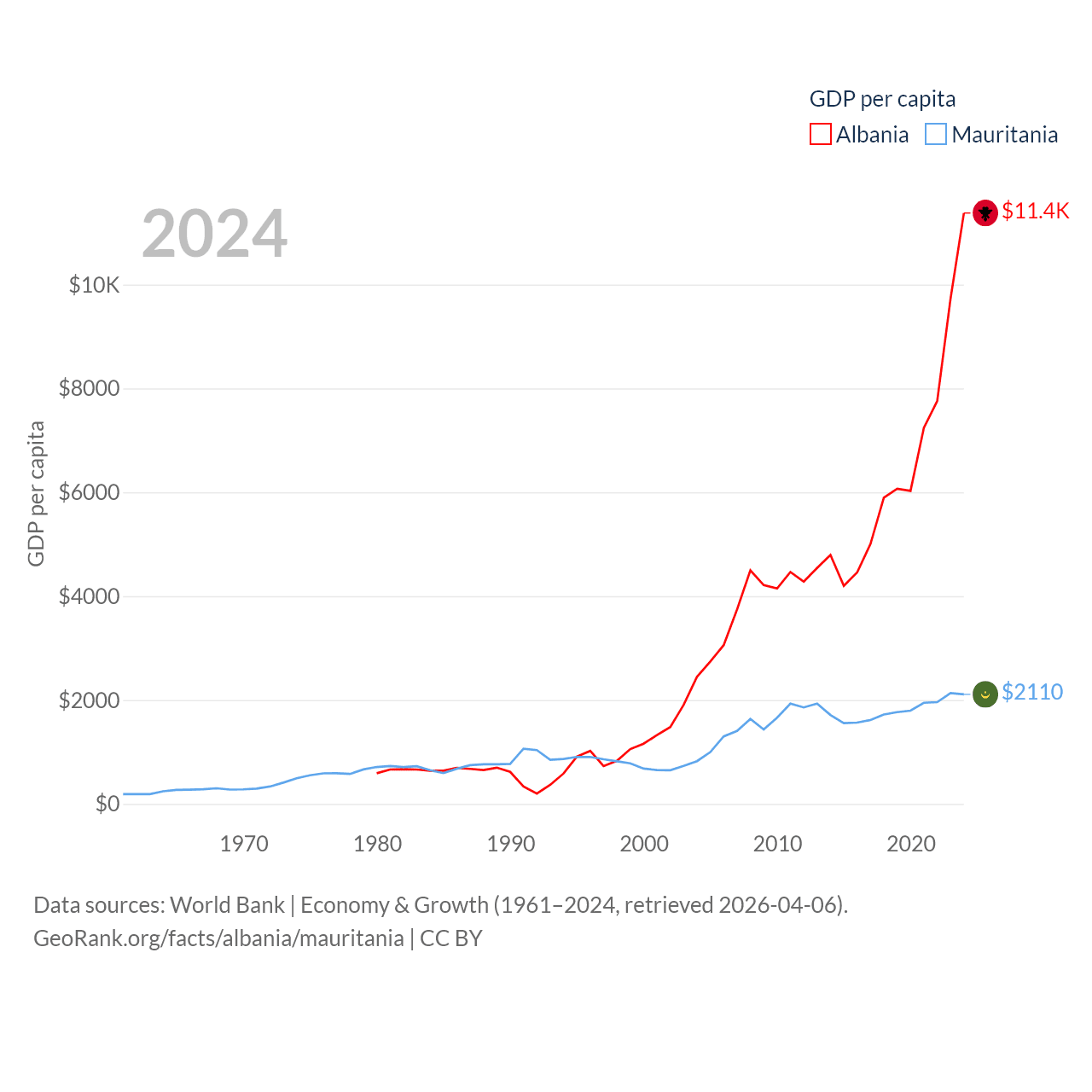 By GDP, Albania ranks 112/197 ($27B) and Mauritania ranks 153/197 ($10.9B). By GDP per capita, Albania ranks 82/197 ($11,378), while Mauritania ranks 156/197 ($2,110).