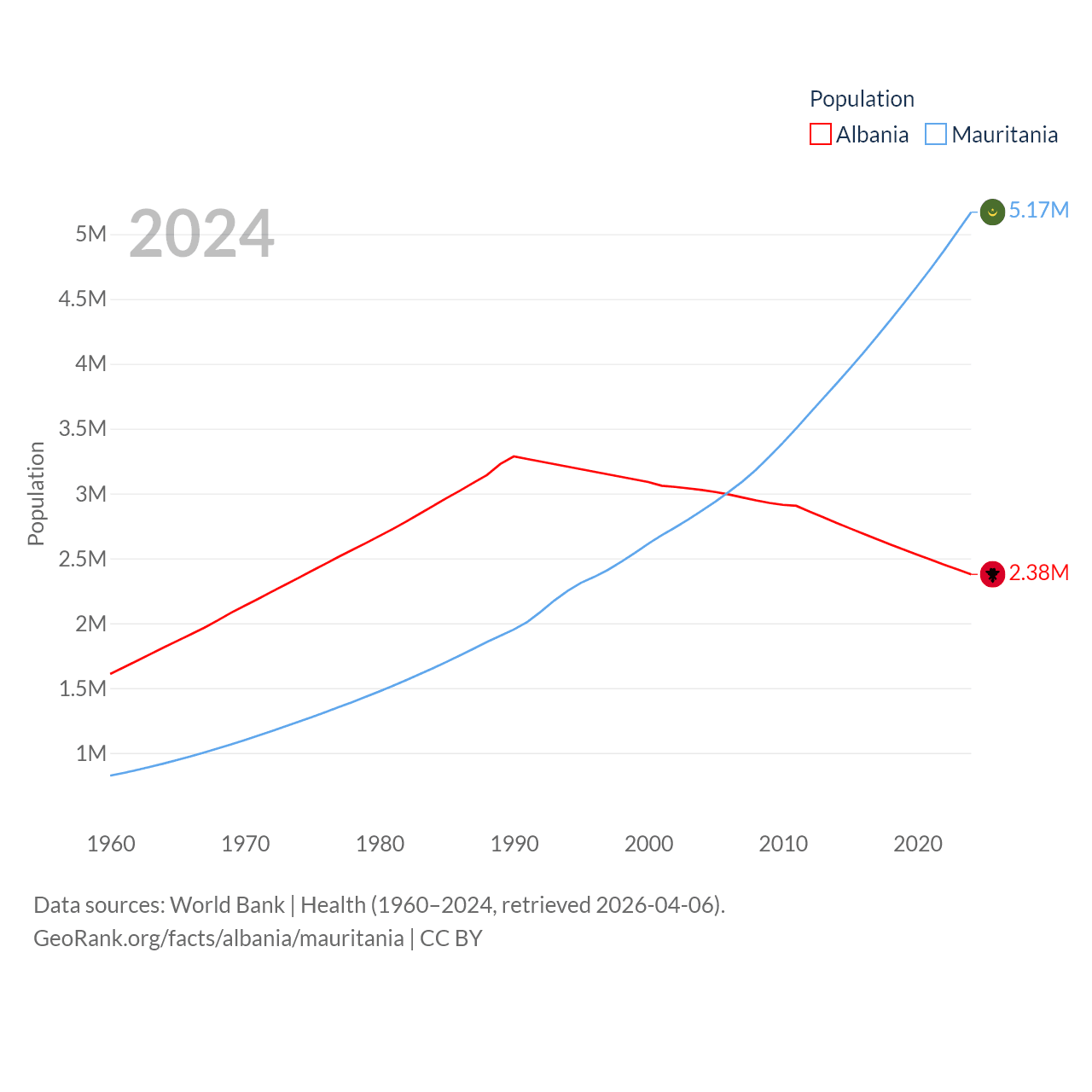 Albania has a population of 2.38M (ranked 144/197), compared with 5.17M in Mauritania (ranked 125/197). Albania's land area is 10,579 sq mi versus 397,955 sq mi for Mauritania (ranked 143rd vs. 28th).