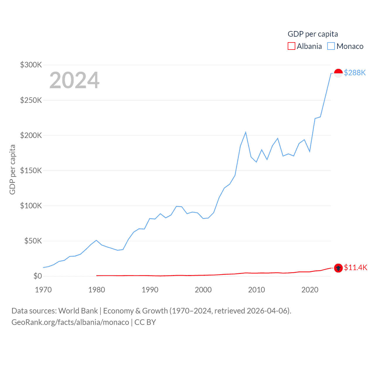 By GDP, Albania ranks 112/197 ($27B) and Monaco ranks 152/197 ($11.1B). By GDP per capita, Albania ranks 82/197 ($11,378), while Monaco ranks 1/197 ($288,001).