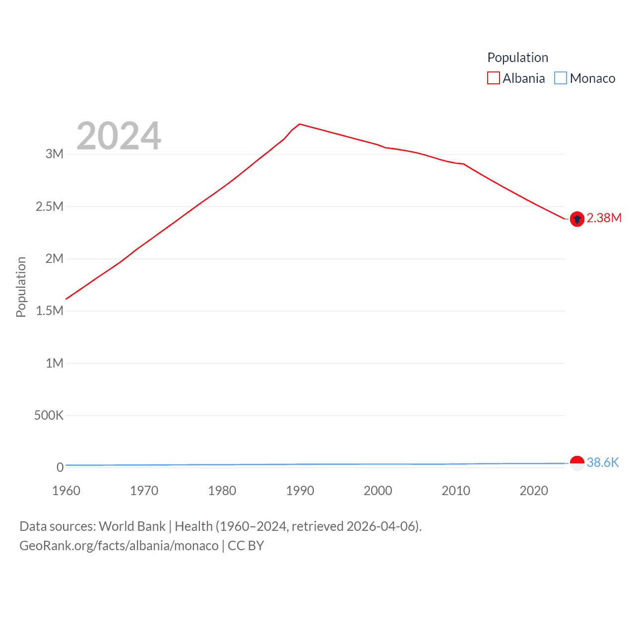 Albania has a population of 2.38M (ranked 144/197), compared with 38.6K in Monaco (ranked 191/197). Albania's land area is 10,579 sq mi versus 0.8 sq mi for Monaco (ranked 143rd vs. 196th).