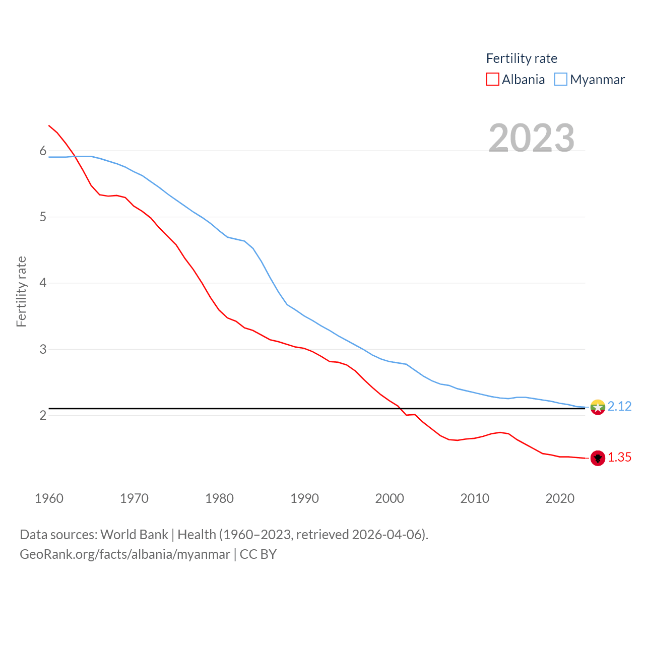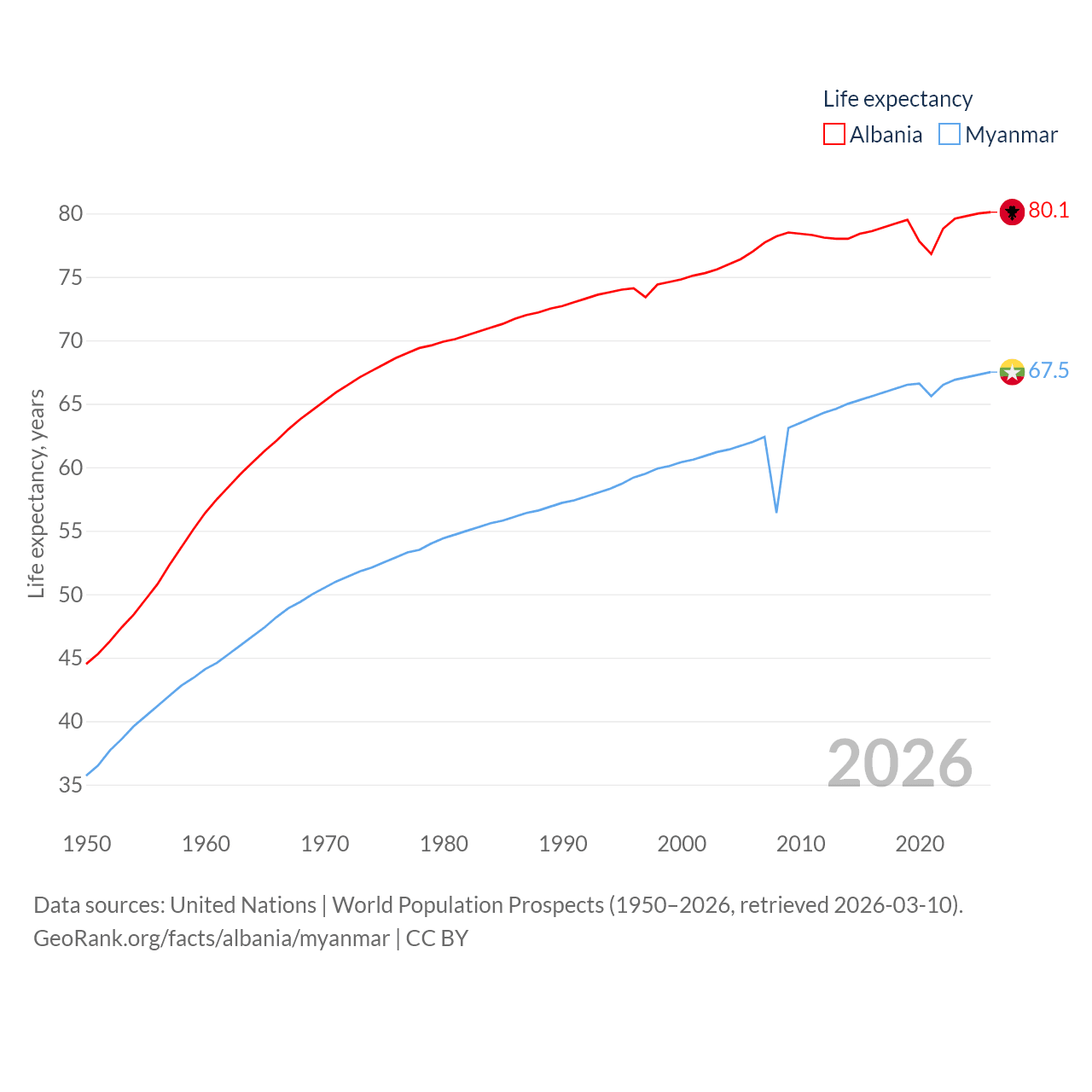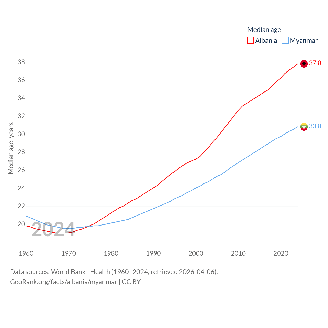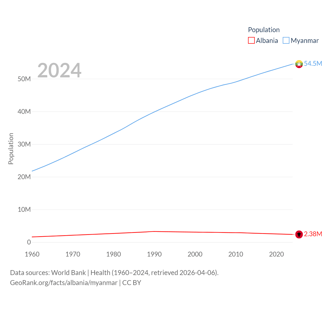 Albania has a population of 2.38M (ranked 144/197), compared with 54.5M in Myanmar (ranked 27/197). Albania's land area is 10,579 sq mi versus 251,997 sq mi for Myanmar (ranked 143rd vs. 39th).