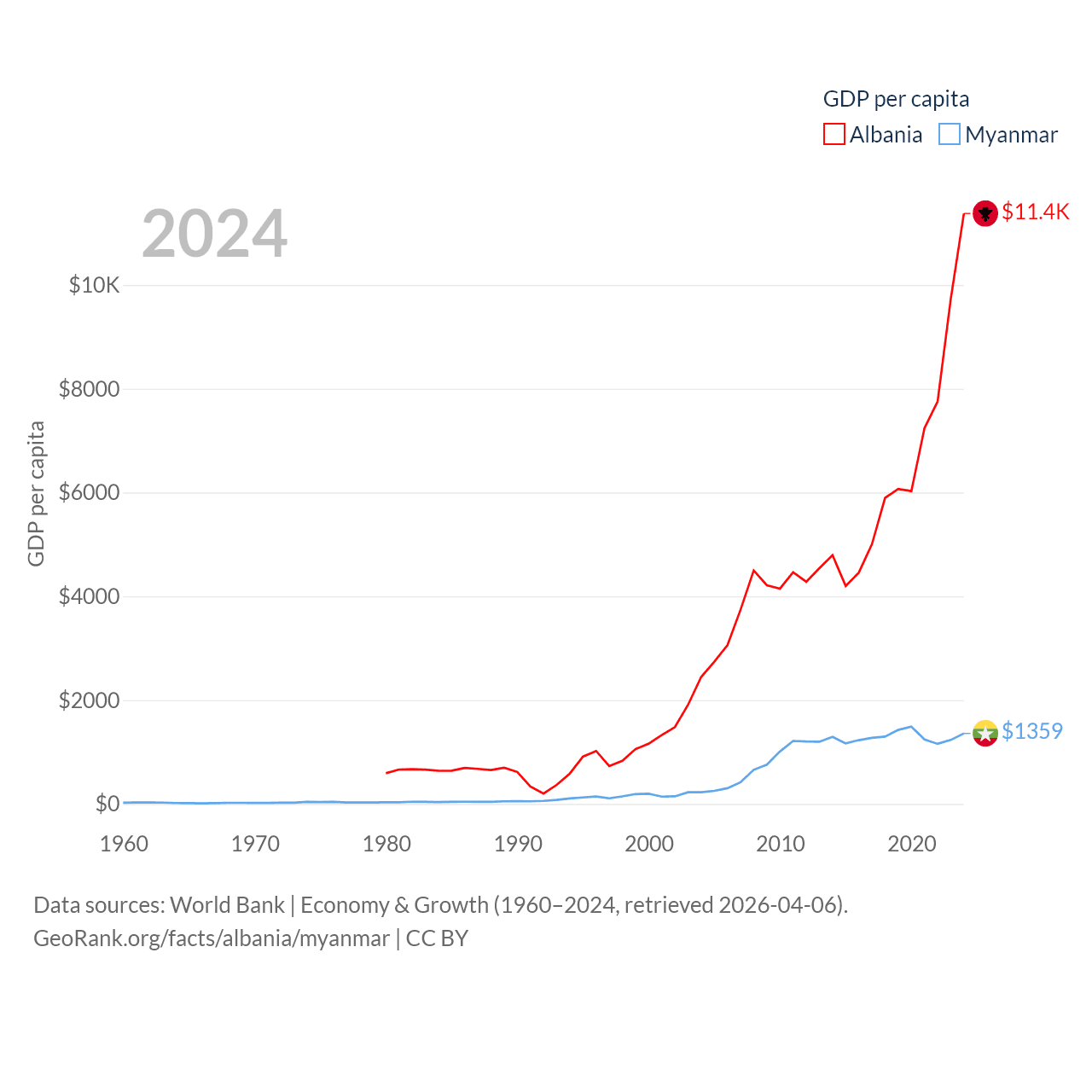 By GDP, Albania ranks 112/197 ($27B) and Myanmar ranks 85/197 ($74.1B). By GDP per capita, Albania ranks 82/197 ($11,378), while Myanmar ranks 165/197 ($1,359).