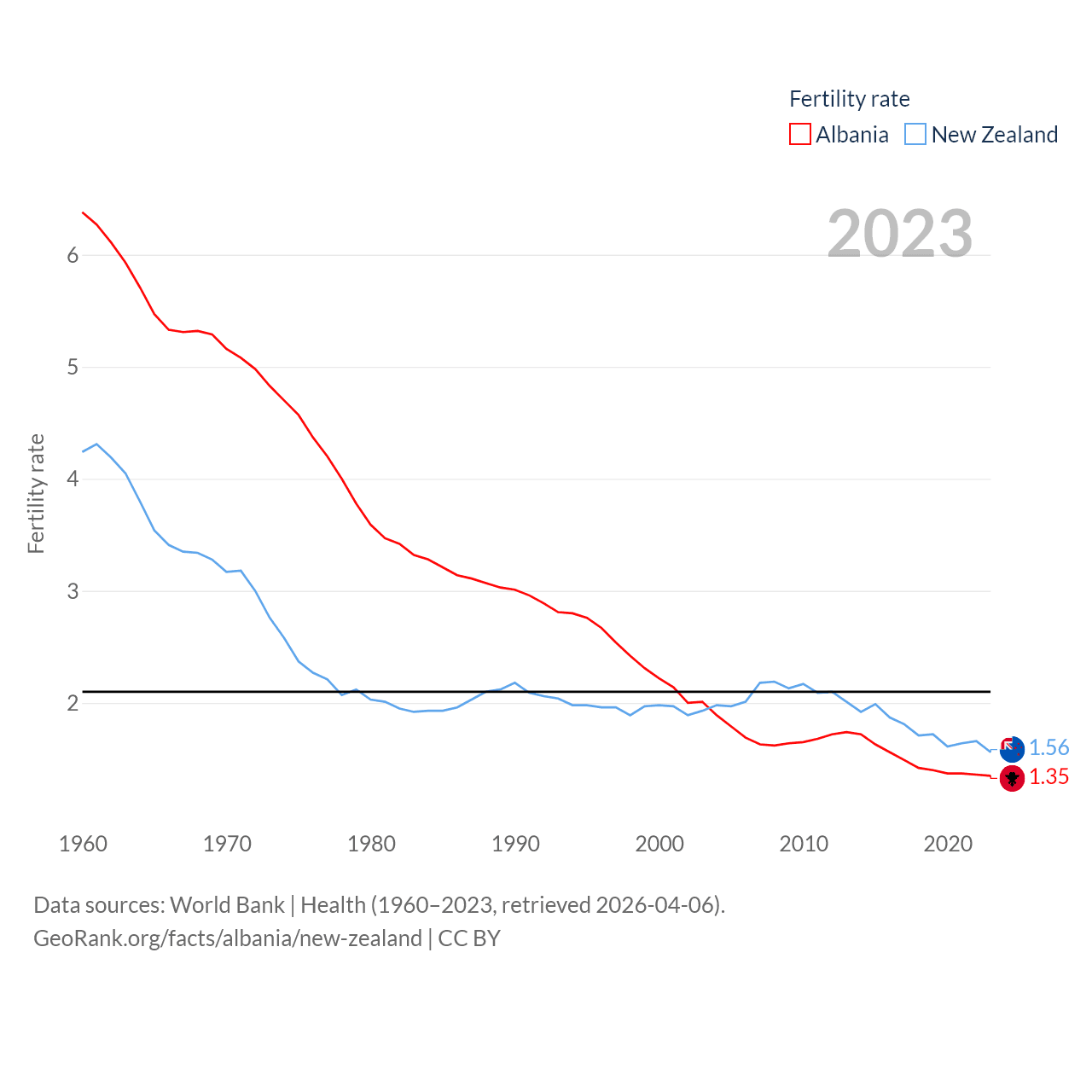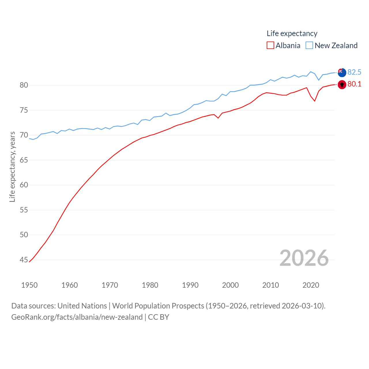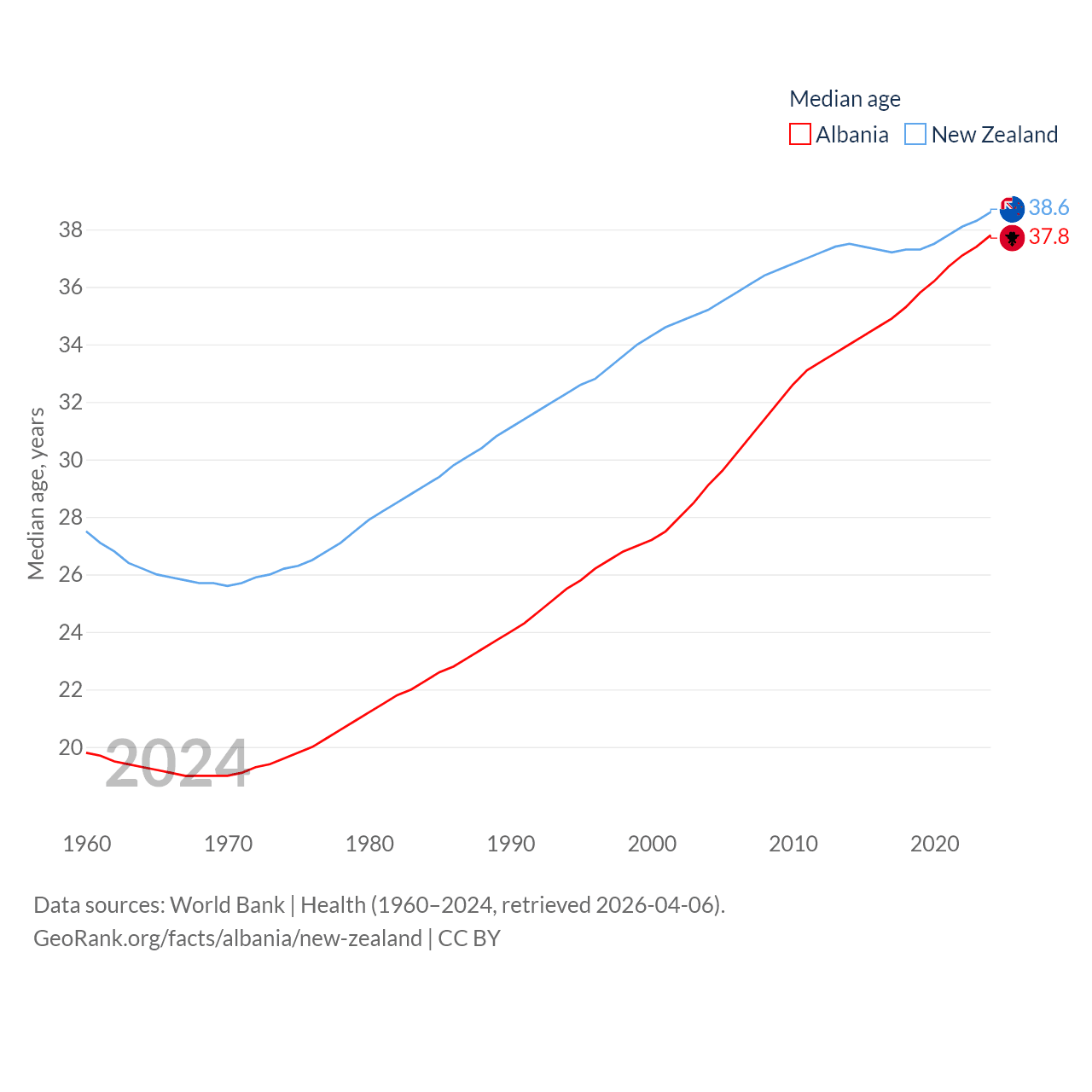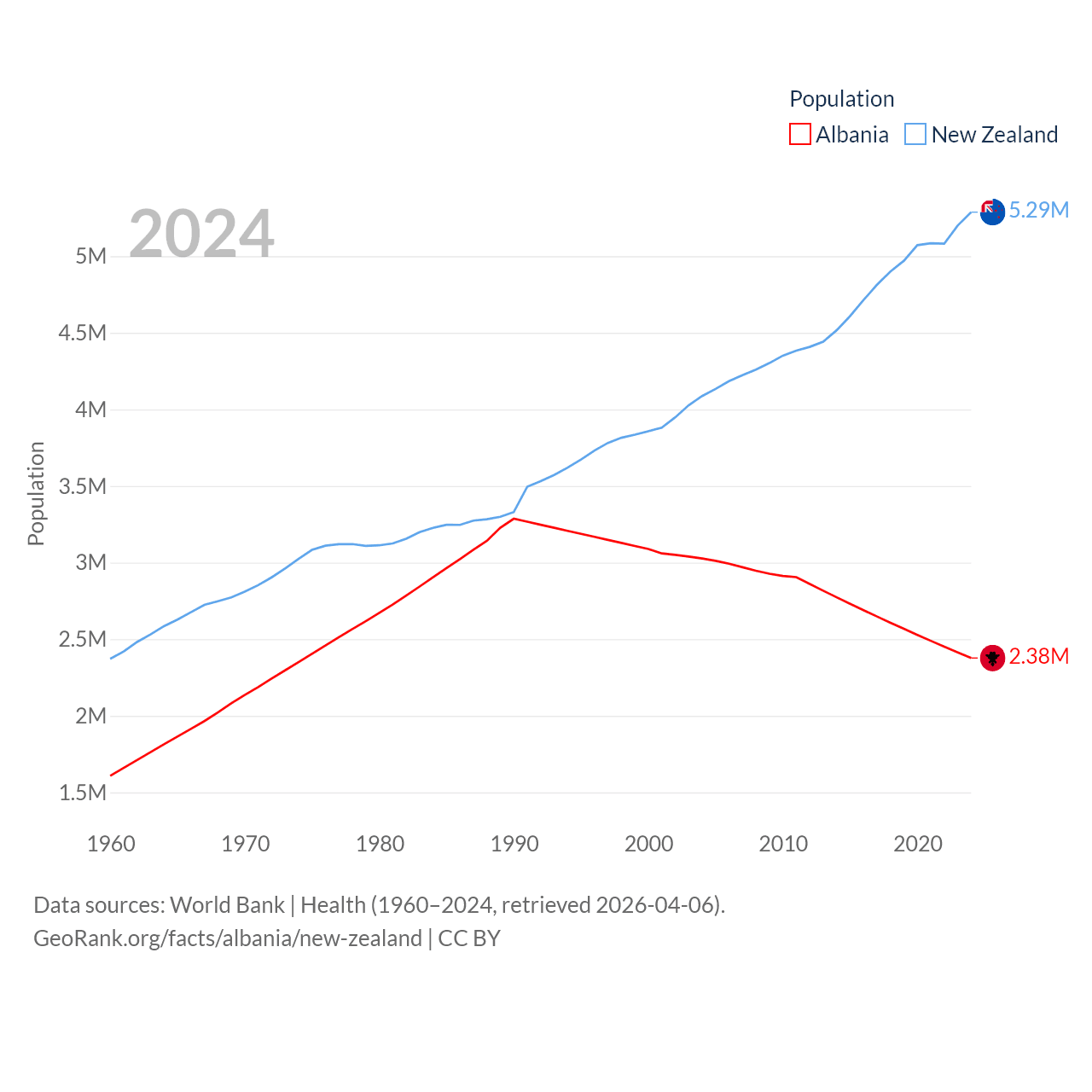 Albania has a population of 2.38M (ranked 144/197), compared with 5.29M in New Zealand (ranked 123/197). Albania's land area is 10,579 sq mi versus 101,665 sq mi for New Zealand (ranked 143rd vs. 74th).