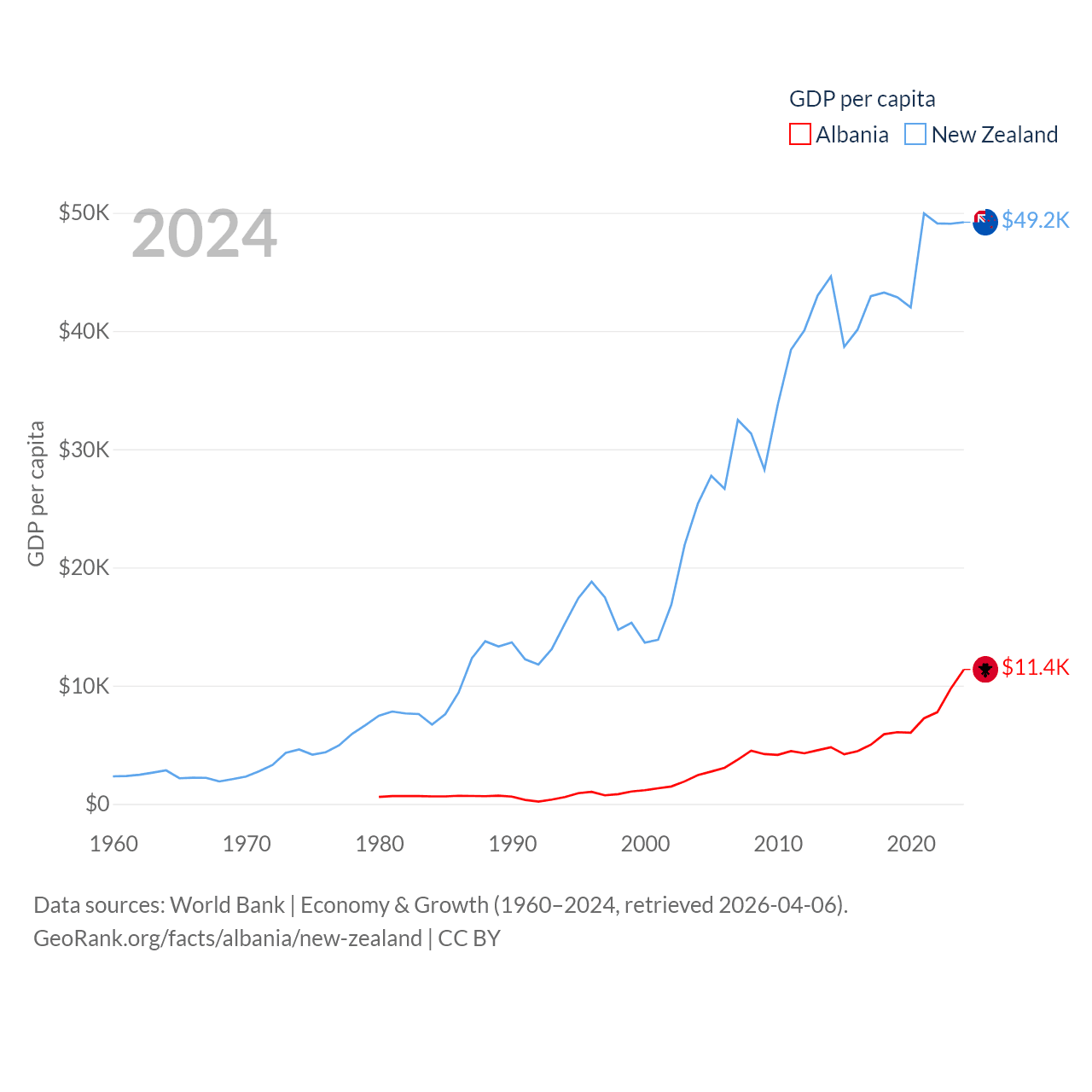 By GDP, Albania ranks 112/197 ($27B) and New Zealand ranks 52/197 ($260B). By GDP per capita, Albania ranks 82/197 ($11,378), while New Zealand ranks 26/197 ($49,205).