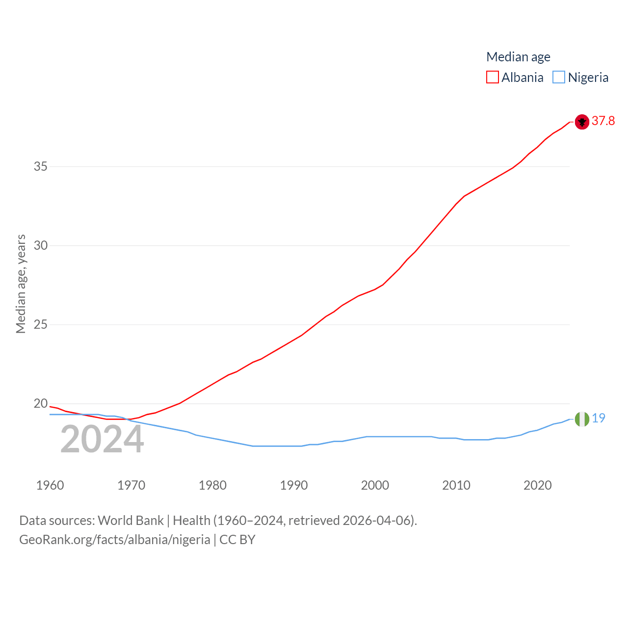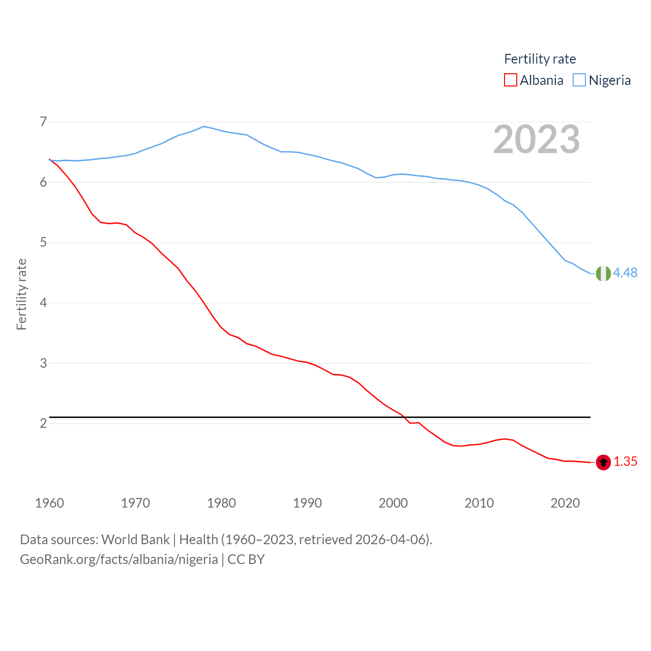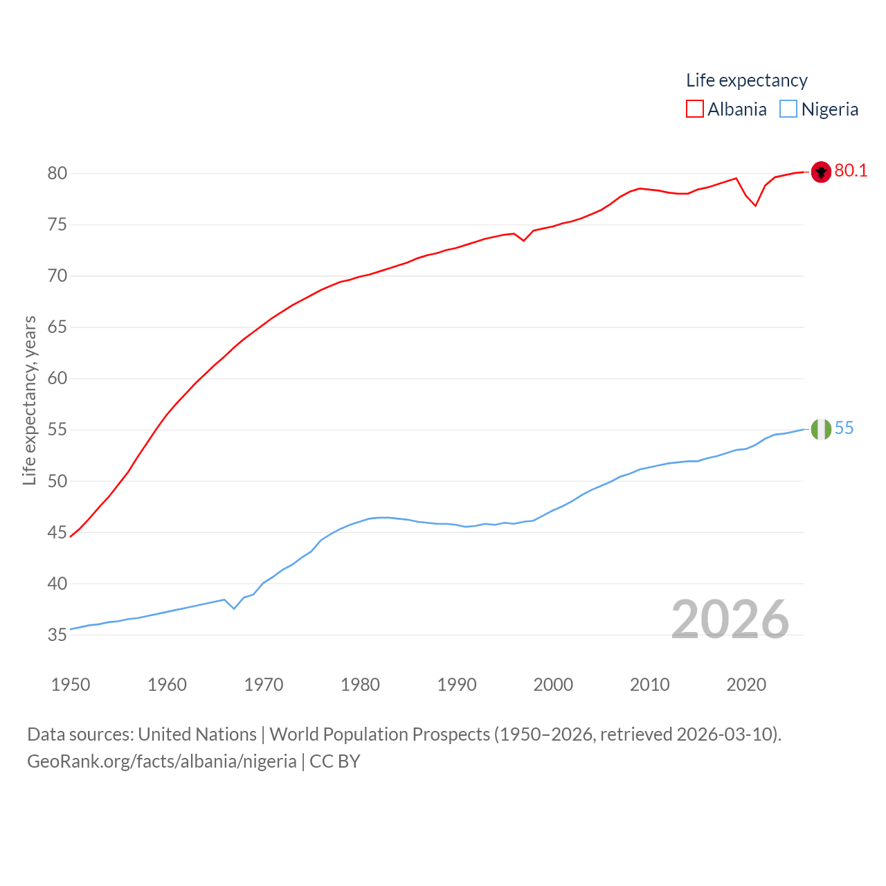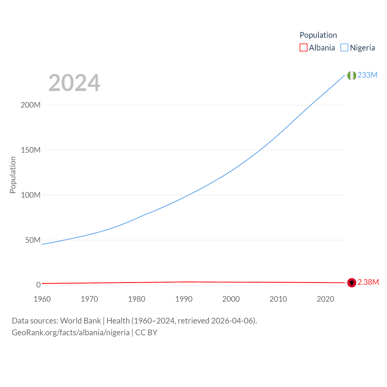 Albania has a population of 2.38M (ranked 144/197), compared with 233M in Nigeria (ranked 6/197). Albania's land area is 10,579 sq mi versus 351,650 sq mi for Nigeria (ranked 143rd vs. 30th).
