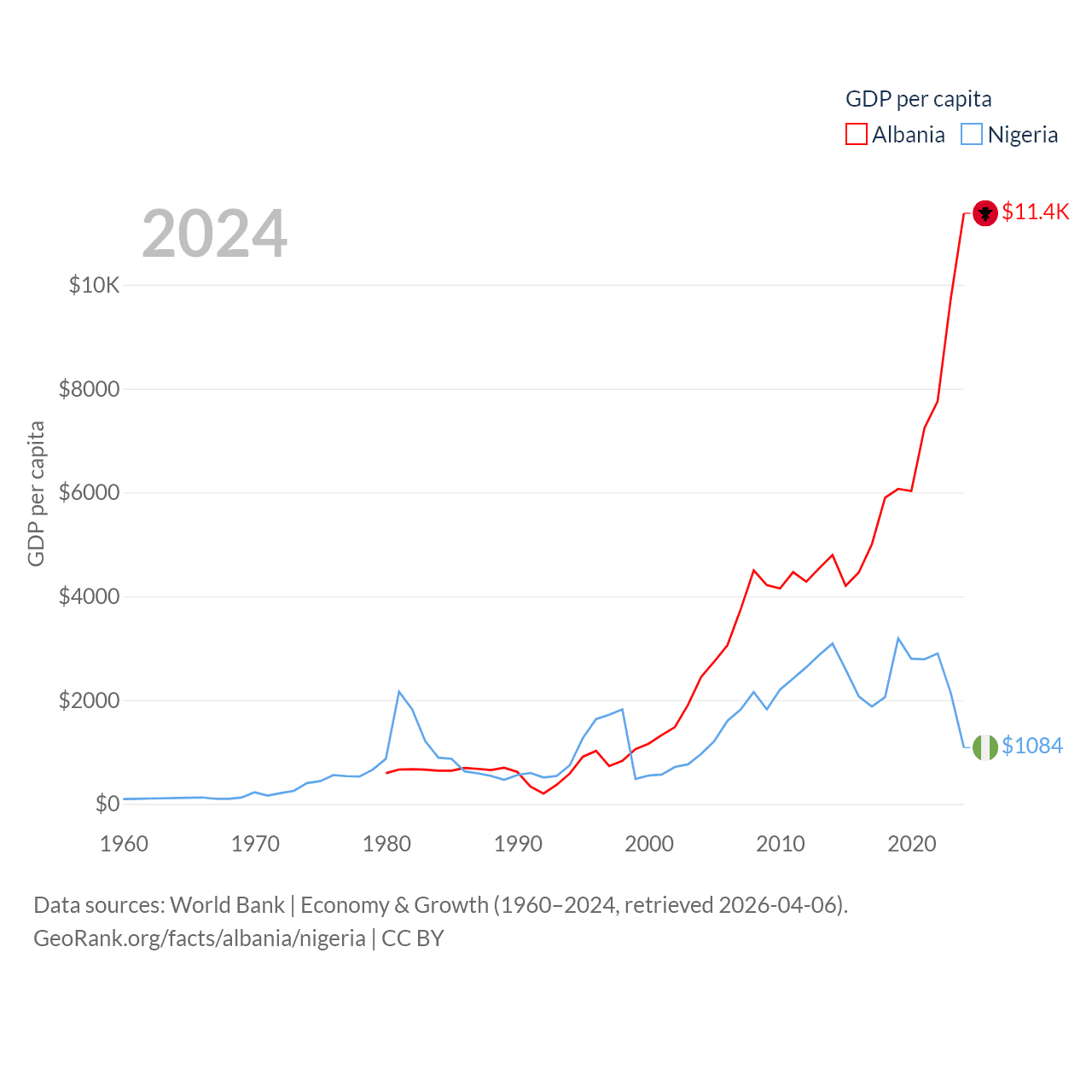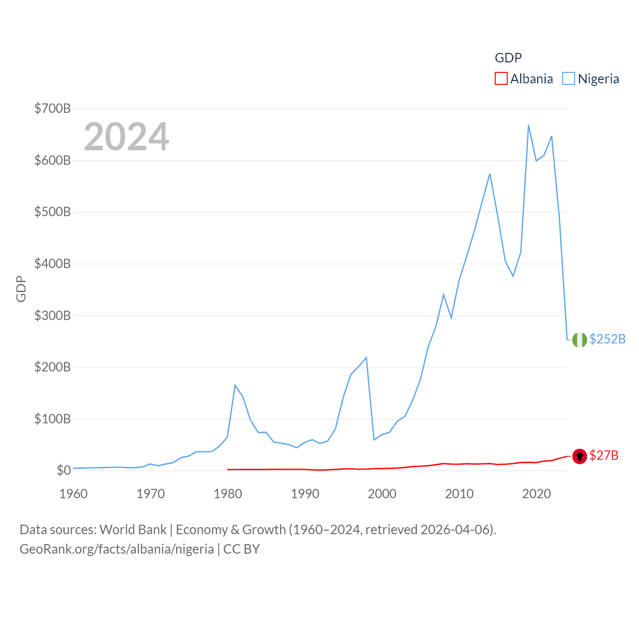 By GDP, Albania ranks 112/197 ($27B) and Nigeria ranks 54/197 ($252B). By GDP per capita, Albania ranks 82/197 ($11,378), while Nigeria ranks 174/197 ($1,084).